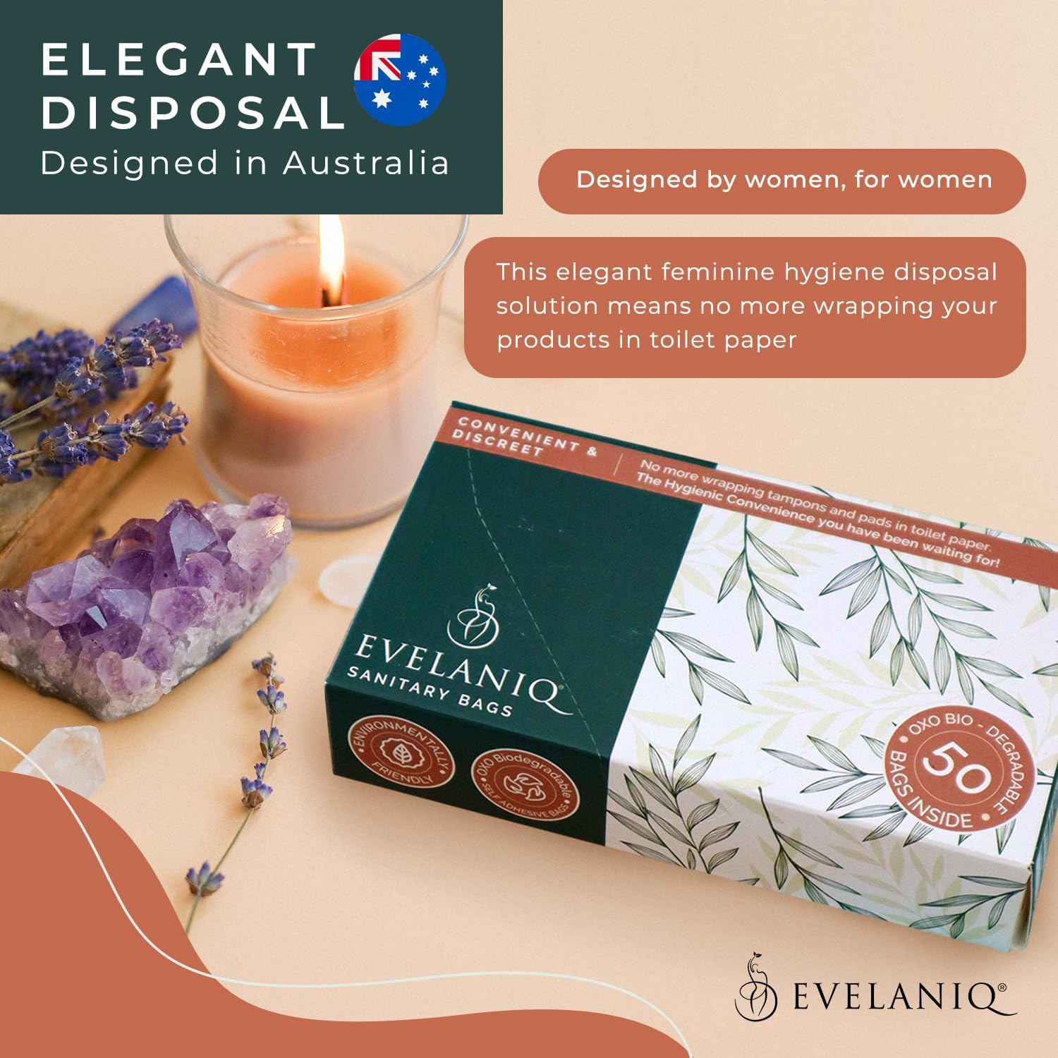 - NATURE FRIENDLY BIO-POLYMER BAGS: Unlike cheap plastic bags, Evelaniq bags are the nature-friendly solution for feminine hygiene disposal - crafted from OXO bio-polymers so you can enjoy discrete disposal while doing your part to help nature.