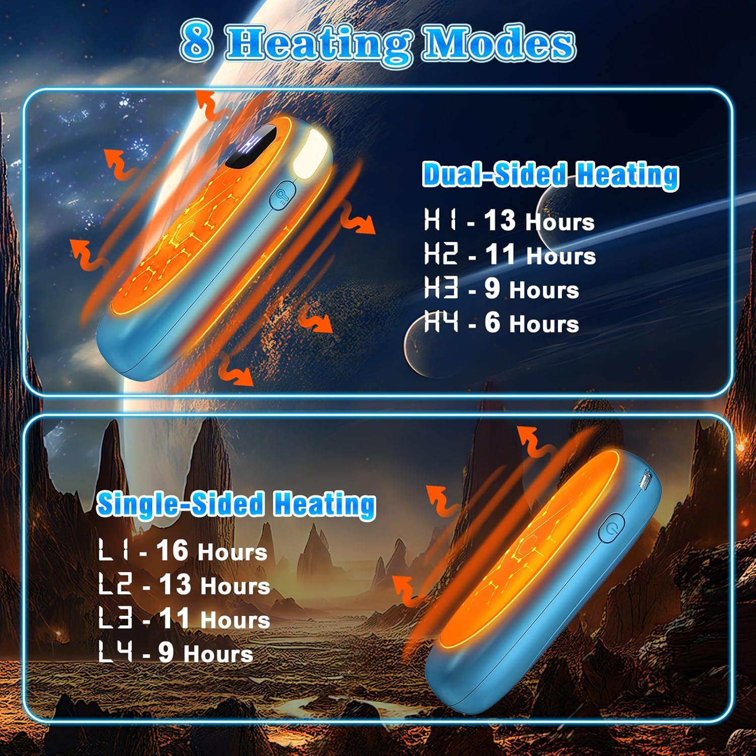 - 【All-Day Warmth】Our hand warmers rechargeable 2 pack with 8000mAh combined capacity ensure you stay warm from start to finish—even on the highest setting, they’ll last through a slow 18-hole round with friends. For double-sided heating (H1/H2/H3/H4), 5 hours toasty warmth on max, 10 hours steady heat on low. Opting for single-sided heating (L1/L2/L3/L4)? You get 7 hours cozy comfort on max, and 13 hours gentle warmth on low—enabled by our battery hand warmers’ outstanding heat conductivity
