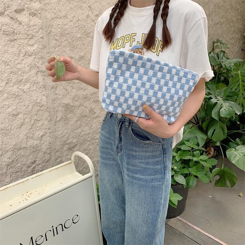 PAZIMIIK Knit Checkered Makeup Bag Large Zipper Make Up Accessory Pouch for Purse Cosmetic Brush Bag for Travel Essential,Blue