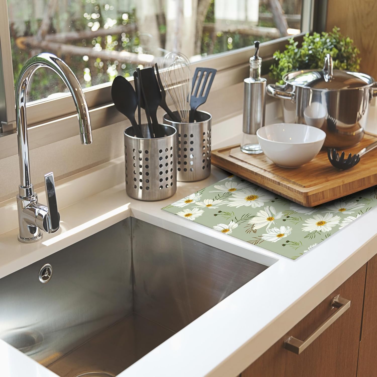 White Daisy Flowers Dish Drying Rack Mat for Kitchen Counter, Dish Drying Pad Absorbent Reversible Microfiber Protector for Coffee Bar Sink Countertops 18x24 Inch