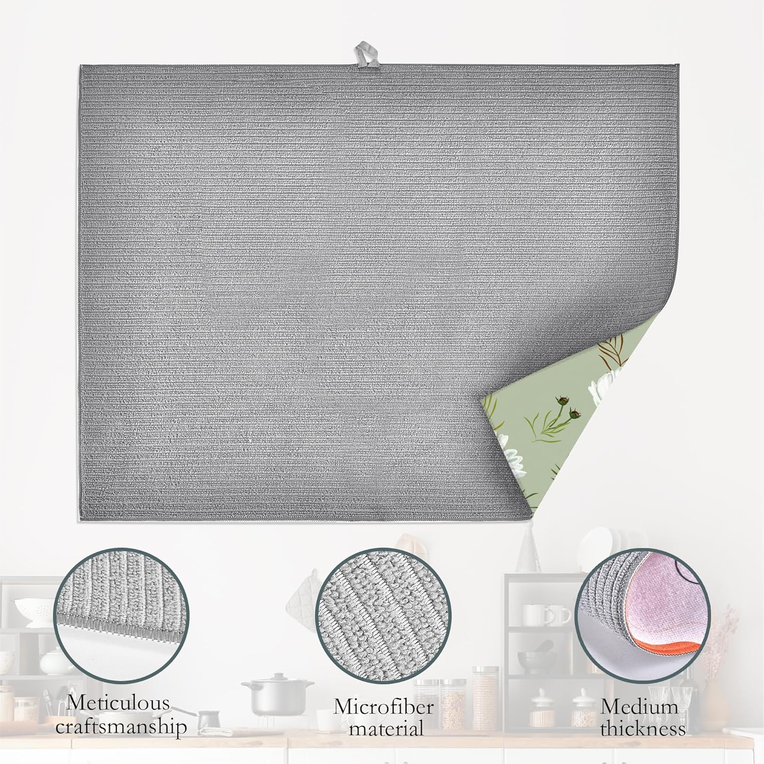 - DESIGN: Reversible with a different design on each side.The dish drying mat with hanging loop, can be hung on the kitchen wall. Soft and foldable, easy to store in any drawer, cabinet, or closet. Microfiber is naturally, long lasting, and cleans up easily, and is effortless to clean.