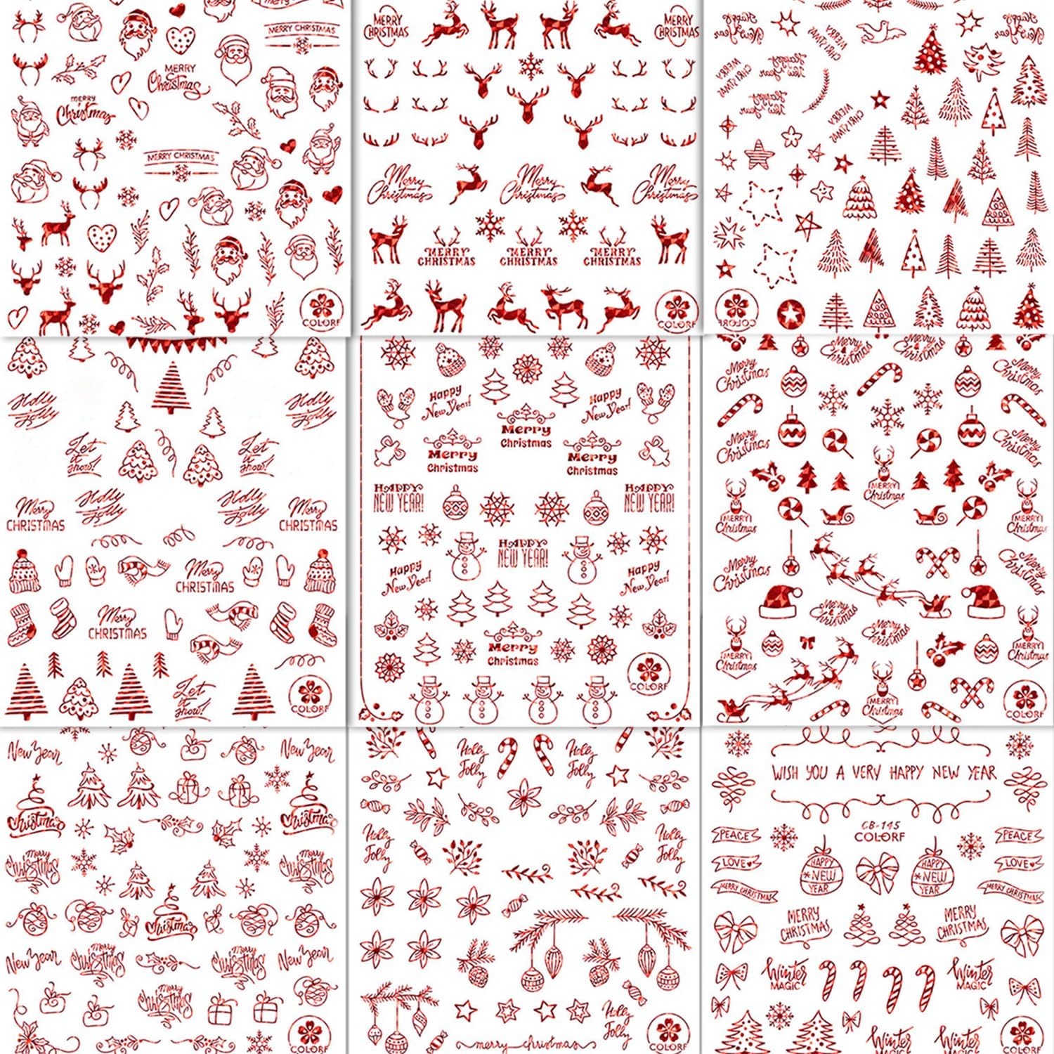 HNUIX Nail Stickers - 3D Christmas, Self Adhesive Nail Decals, Multi Pattern, Red, 9 Sheets, for Nail Art