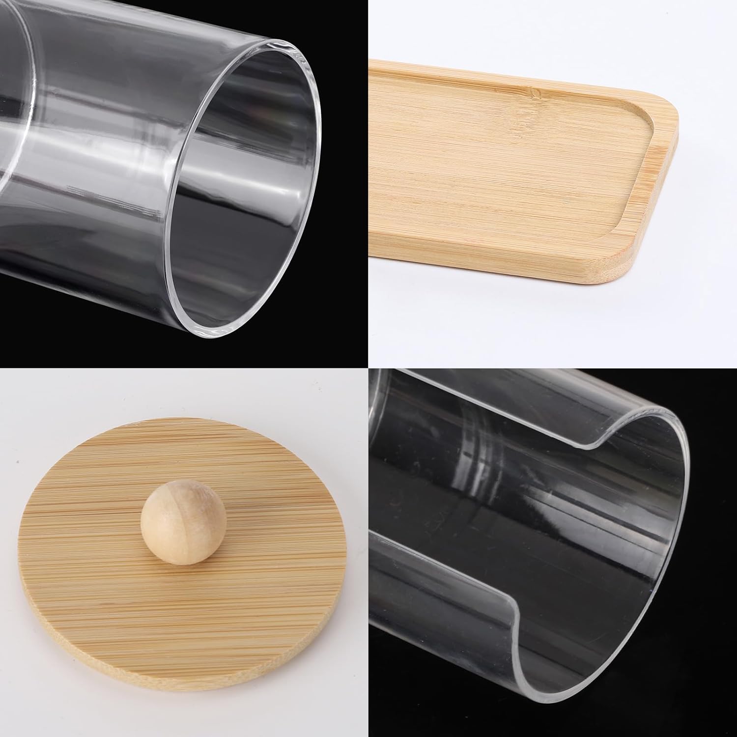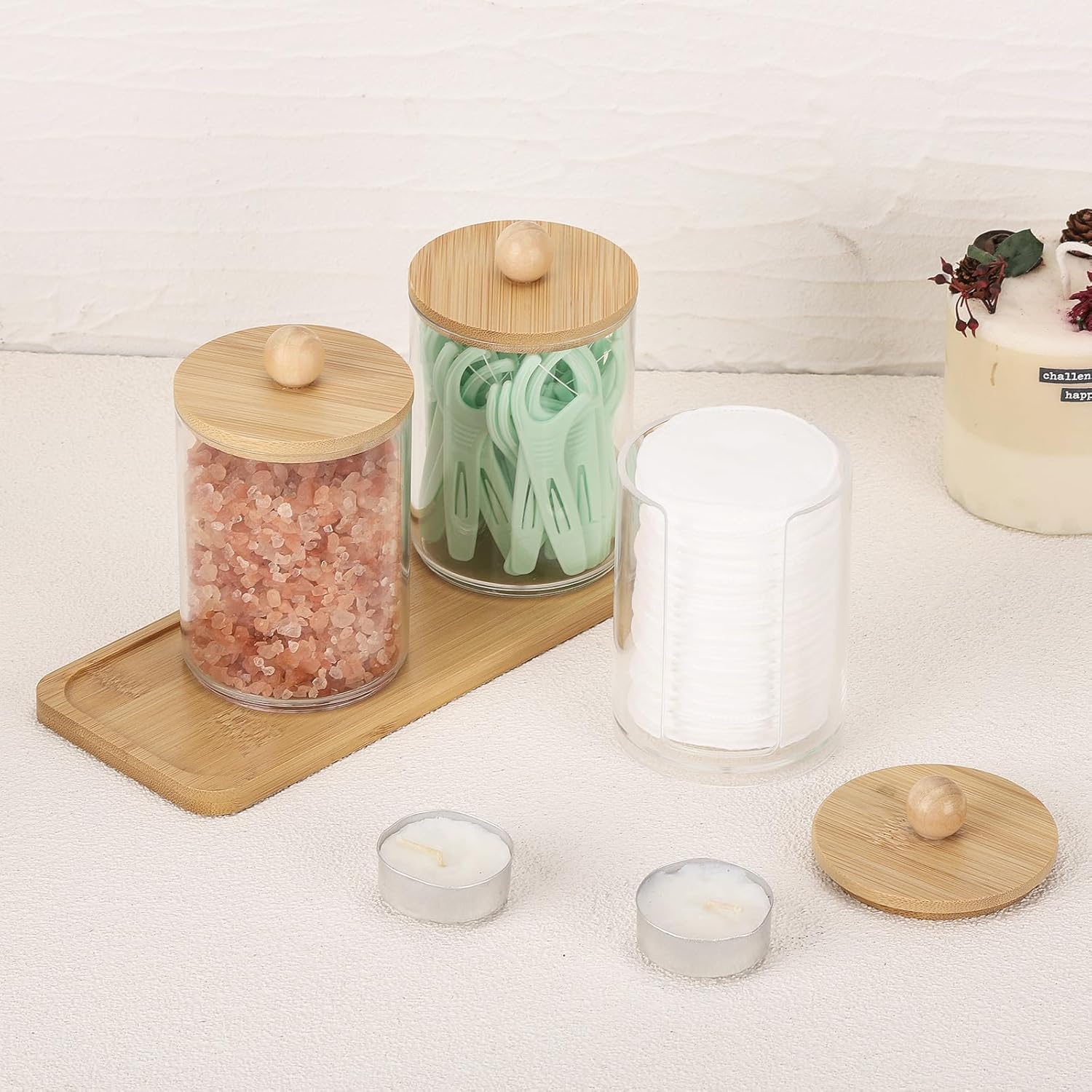Tbestmax 10 oz Qtip Holder with Vanity Tray, 3 Pack Cotton Swab/Ball/Pad Dispenser Apothecary Jar, Clear Bathroom Containers Dispenser for Storage Bamboo Lids