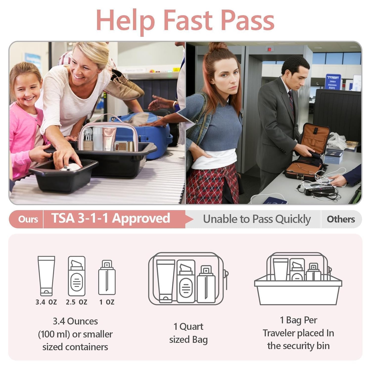 - TSA Approved, Meet Liquids Rule: The medium size clear makeup bag is 7.8 x 2.3 x 5.9 inch, it follows the TSA's 3-1-1 Liquid Rule published by TSA. You can quickly pass the airport security screening. High-quality metal zipper is smooth not get stuck
