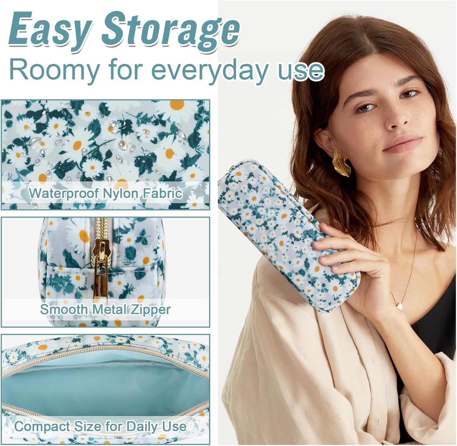 - ❤【Multiple Sizes & Colors】Large, Small, Mini, or Slim, we have it all! Cosmetic bags are available in many colors: Blue-Daisy, Green-Daisy, White-Flower, Pink-Flower and other colors for you to choose. Nylon makeup bag for purse can be used for travel, outdoors and organization, it can be used as a purse bag, travel pouch, clutch, makeup organizer and more.