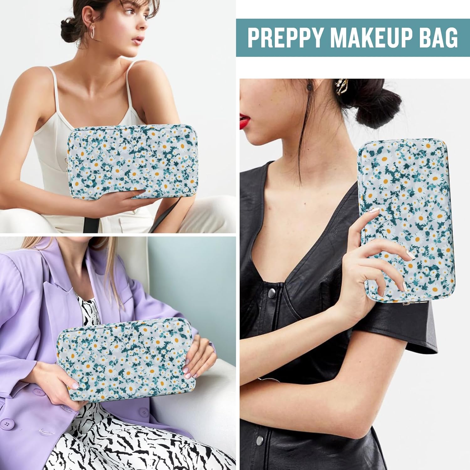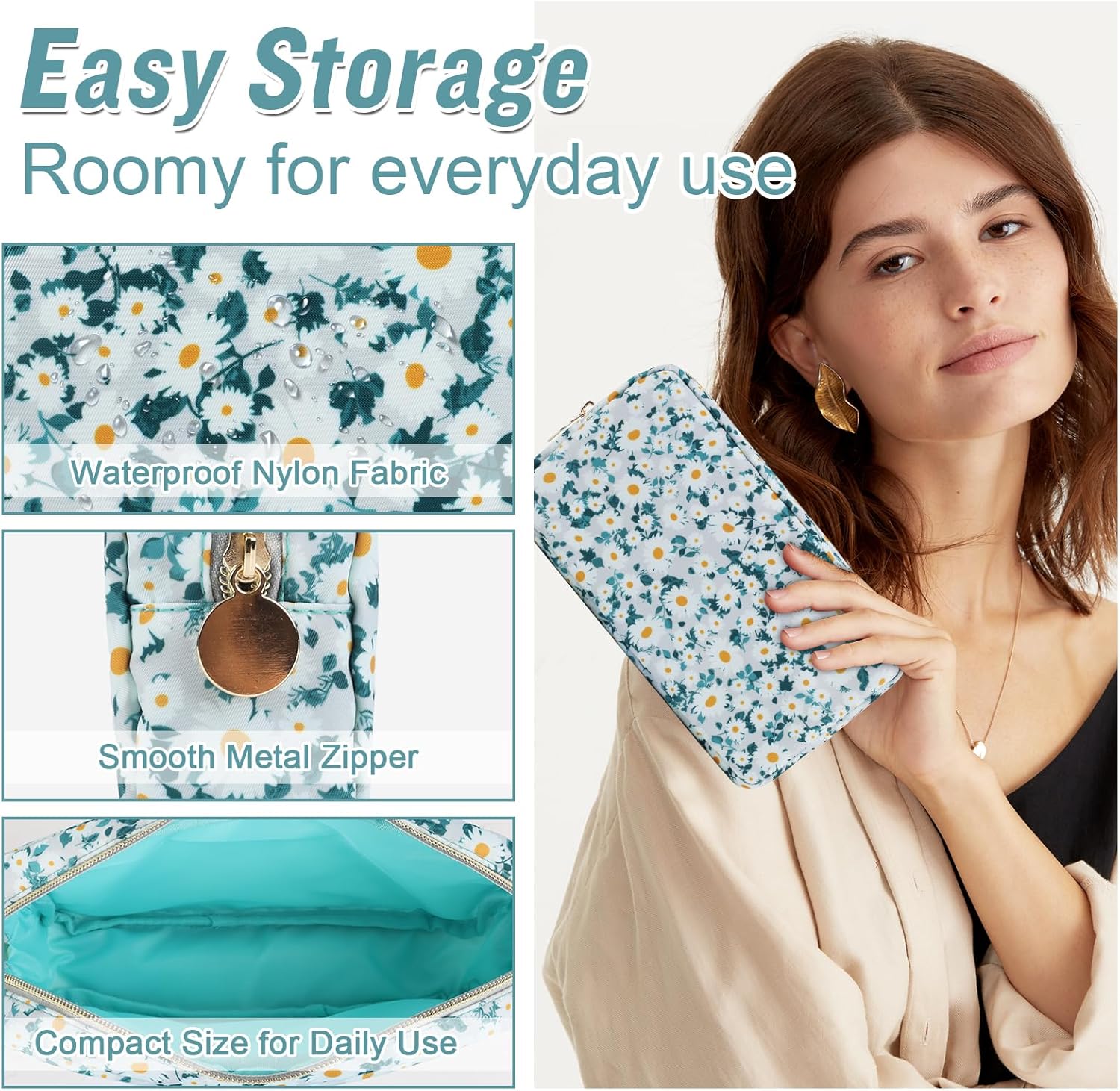 - ❤【Multiple Sizes & Colors】Large, Small, Mini, or Slim, we have it all! Cosmetic bags are available in many colors: Blue-Daisy, Green-Daisy, White-Flower, Pink-Flower and other colors for you to choose. Nylon makeup bag for purse can be used for travel, outdoors and organization, it can be used as a coin pouch, purse bag, travel pouch, clutch, makeup organizer and more.