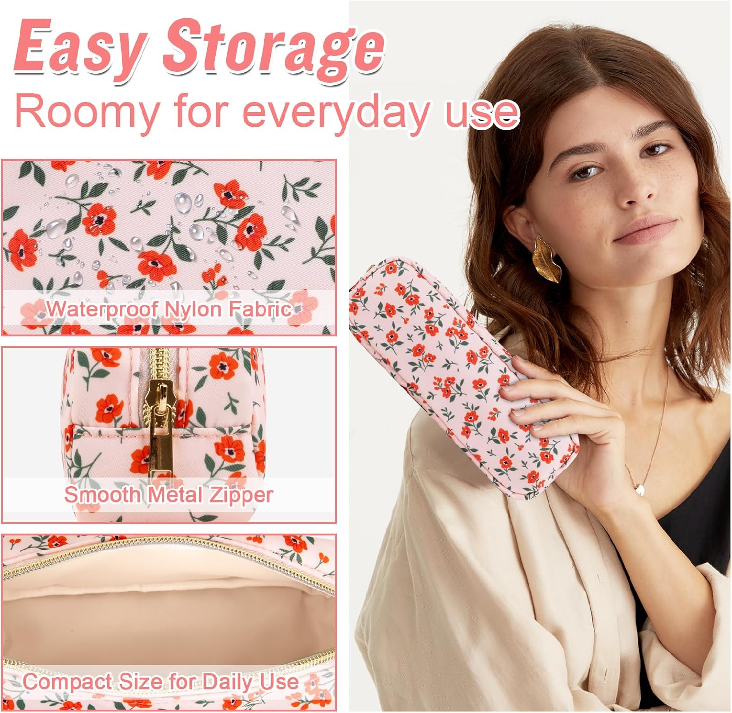 - ❤【Premium Materials】Slim Small floral makeup bag is made of high-quality nylon waterproof material and durable gold zipper, which does not fade, has no peculiar smell, and is durable. Stylish appearance, easy to wipe clean, dustproof and waterproof. The makeup pouch interior is covered with thick sponge to protect your belongings at all times.