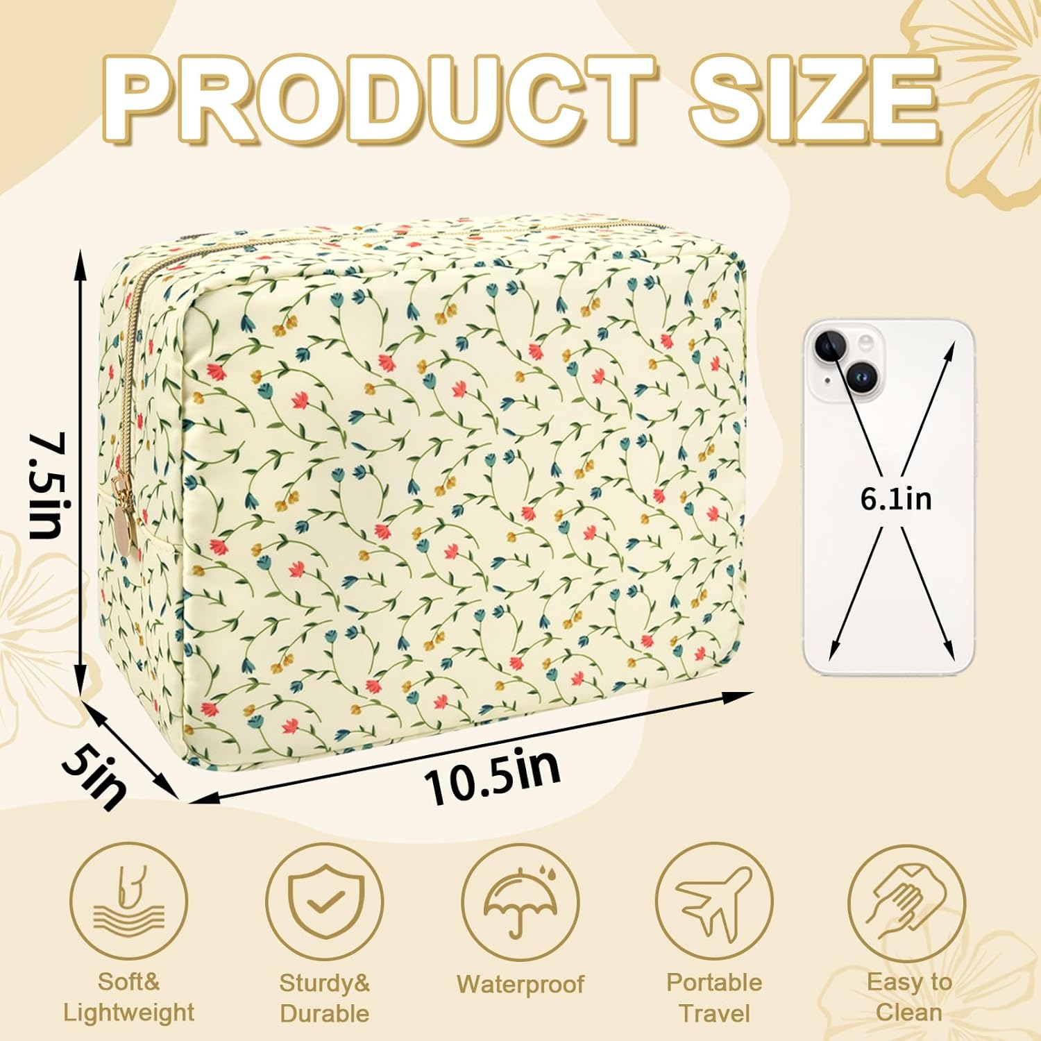 Waterproof Large Floral Makeup Bag Pouch,Nylon Travel Toiletry Storage Bag Preppy Flower Cosmetic Bag for Women Girl,Large Capacity Makeup Organizer Bag Cute Zipper Pouch(L Light Yellow-Flowers)