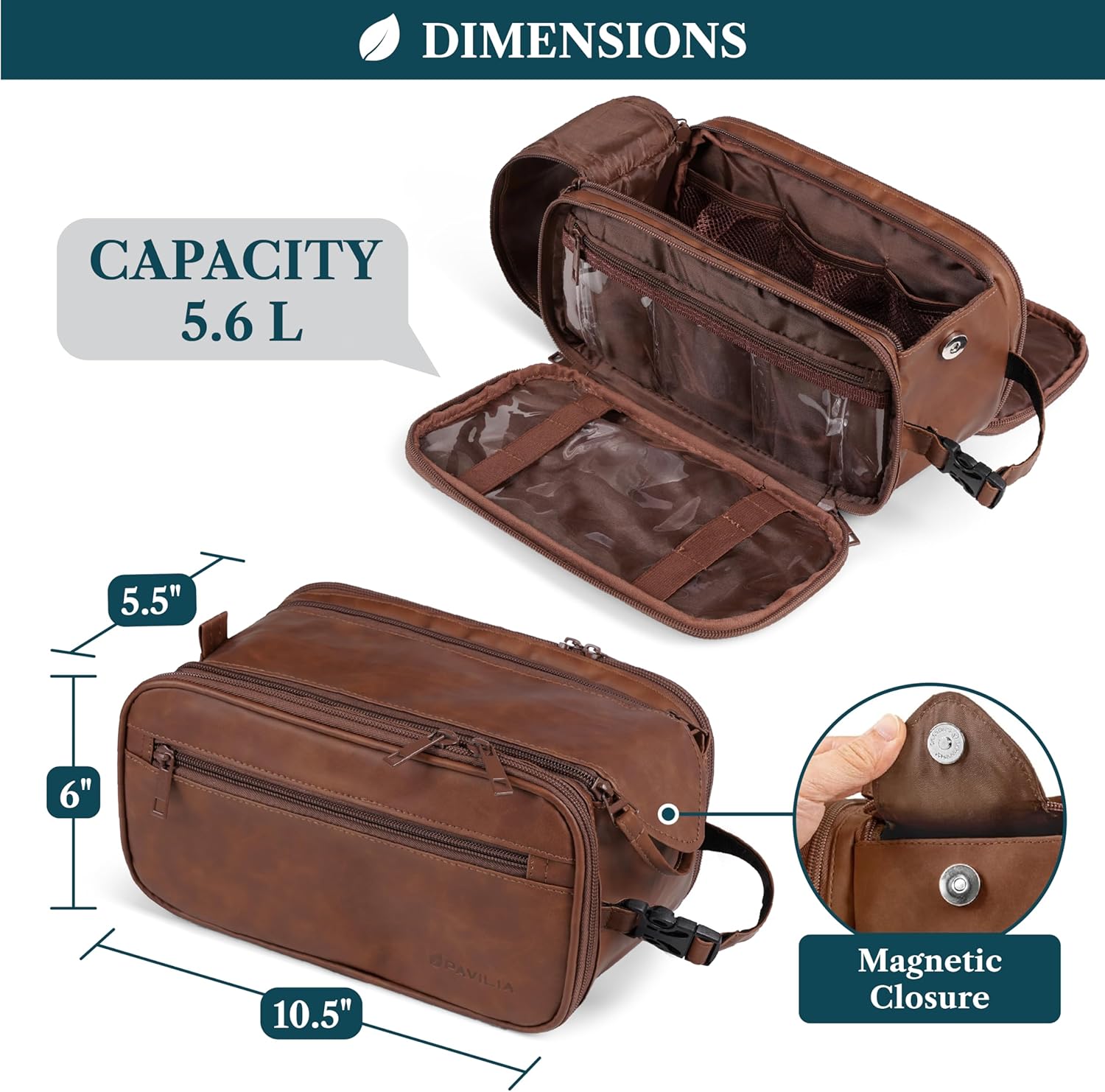 - WATER RESISTANT TOILETRY BAG DOPP KIT: This toiletry case kit is made from high density PU leather with added side padding for durability and extra protection to keep your toiletries safe and protected during travel. The lining is water-resistant to prevent liquid splashes from entering the bag or luggage. The toiletry bag also offers excellent wet/dry separation so you can keep wet accessories in a separate compartment from dry toiletries during camping, road trips, weekenders.