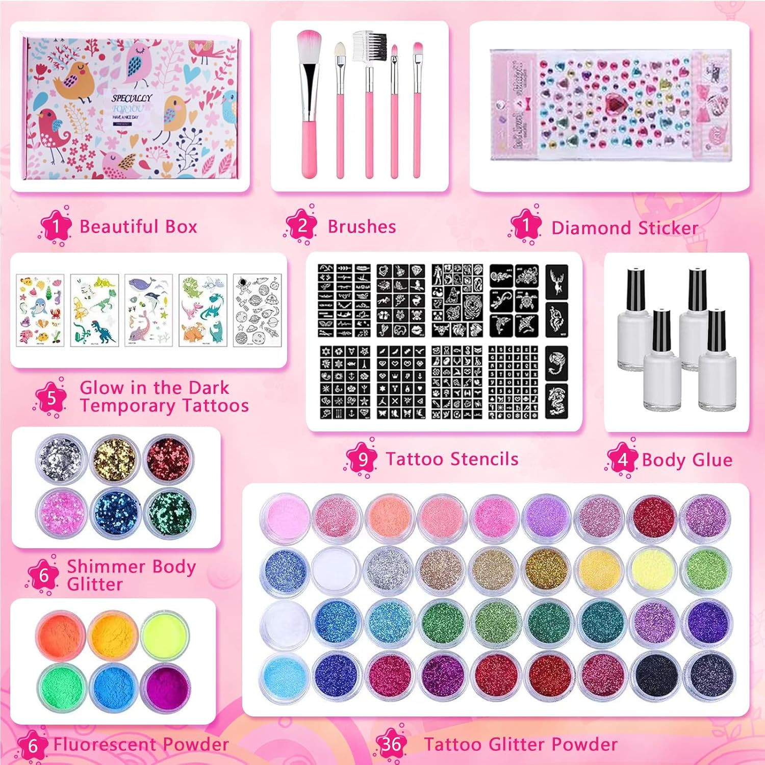 - Complete Temporary Glitter Tattoos Kit: This glitter tattoos kit contains 36 vibrant colors, 6 fluorescent colors, 6 shimmer colors glitter powder, 4 glues, 5 brushes, 209 unique stencils, 1 sheet diamond sticker, and 5 luminous tattoo stickers. Its prepared everything necessary for you to design and customize your desired favourite glitter tattoos, perfect for kids and adults for endless creativity and fun!