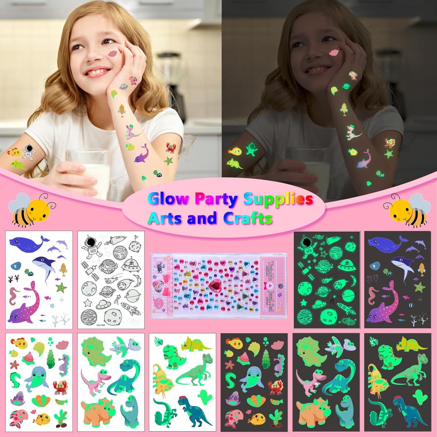 Temporary Glitter Tattoos Kit Kids, 48 Colors Powder with 209 Temporary Tattoo Stencils and 5 Luminous Tattoo Stickers, Body Nail Arts and Craft Glitter Make Up Kit, Gifts for Girl Boy Party