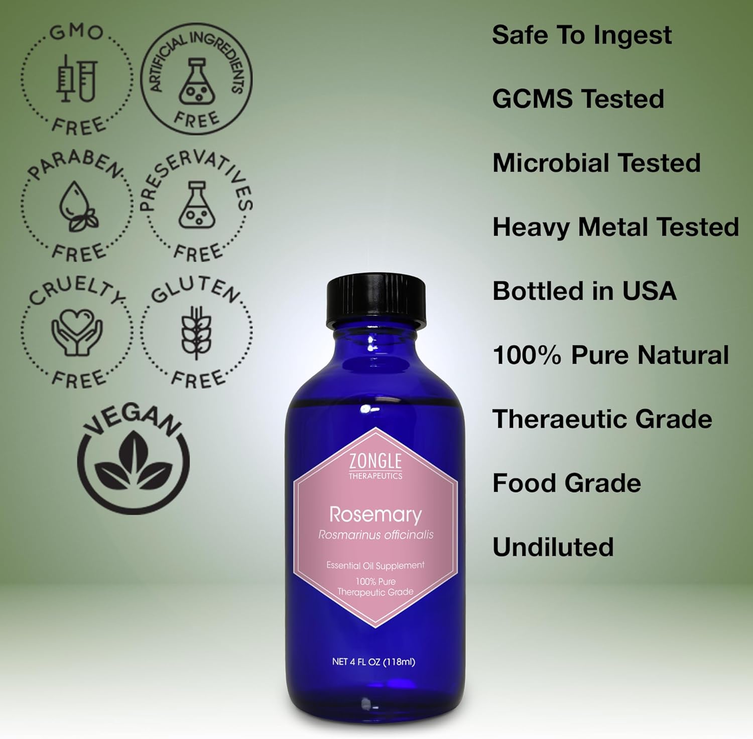 Rosemary Oil, Food Grade, for Hair, Growth – 100% Pure, Edible, Rosemary Essential Oil, by Zongle Therapeutics, 4 OZ