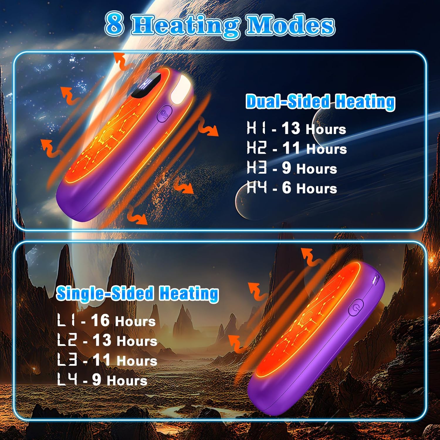 - 【4 Heat Levels & 8 Heating Modes】Experience our electric hand warmers rechargeable with 4 adjustable levels for both single-side and dual-side heating, providing a total of 8 heating modes. Whether you're facing chilly outdoor adventures or just need a little extra warmth during everyday activities, our electric hand warmer is the perfect companion, offering a customized heating experience at your fingertips