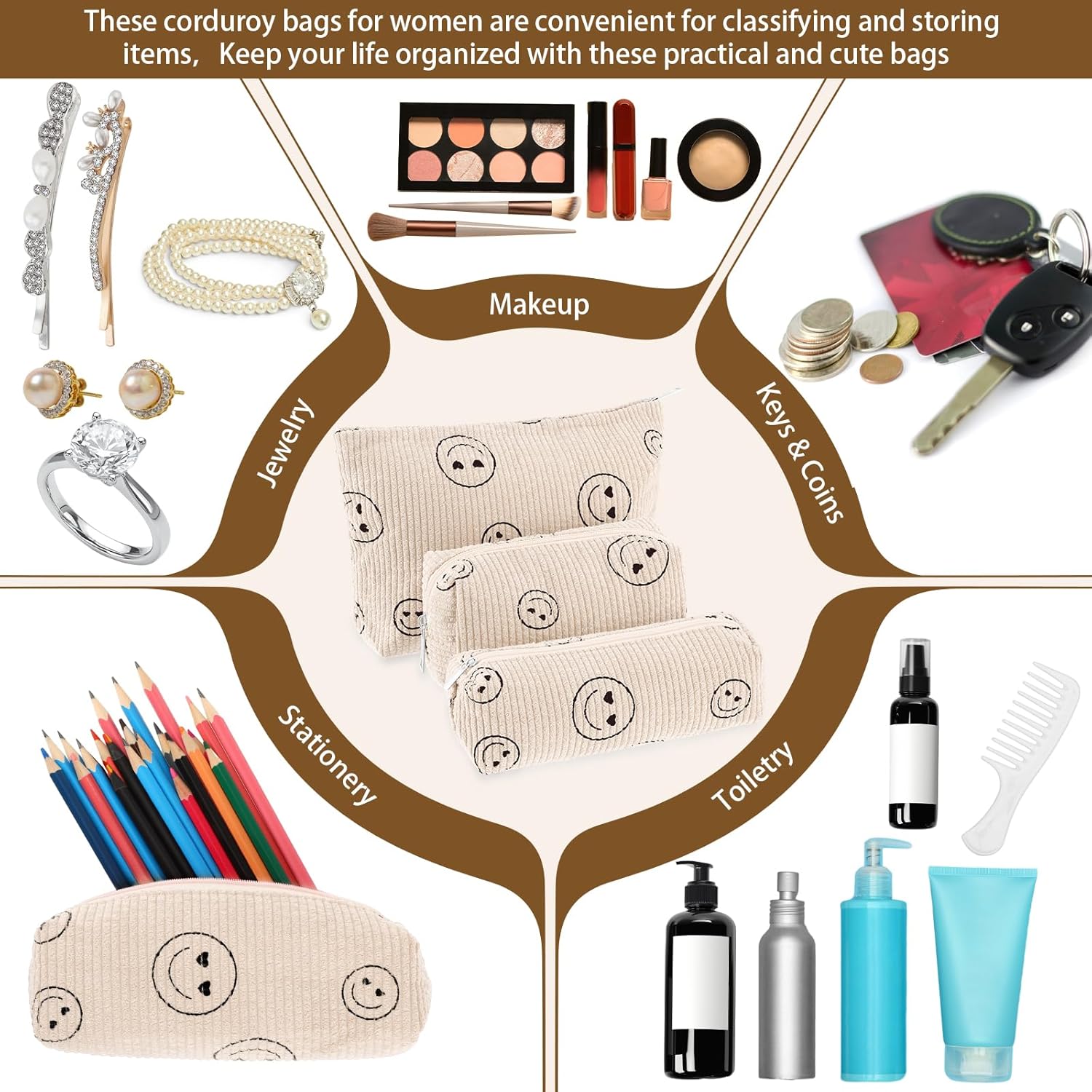 - Material and Attractive Design: the makeup and toiletry travel bag set is mainly crafted from quality corduroy material, ensuring high durability and prolonged service life; The bags feature an adorable and delicate design with scattered cute smiling faces in different sizes on the beige color surface; This makes them compatible with various styles of outfits