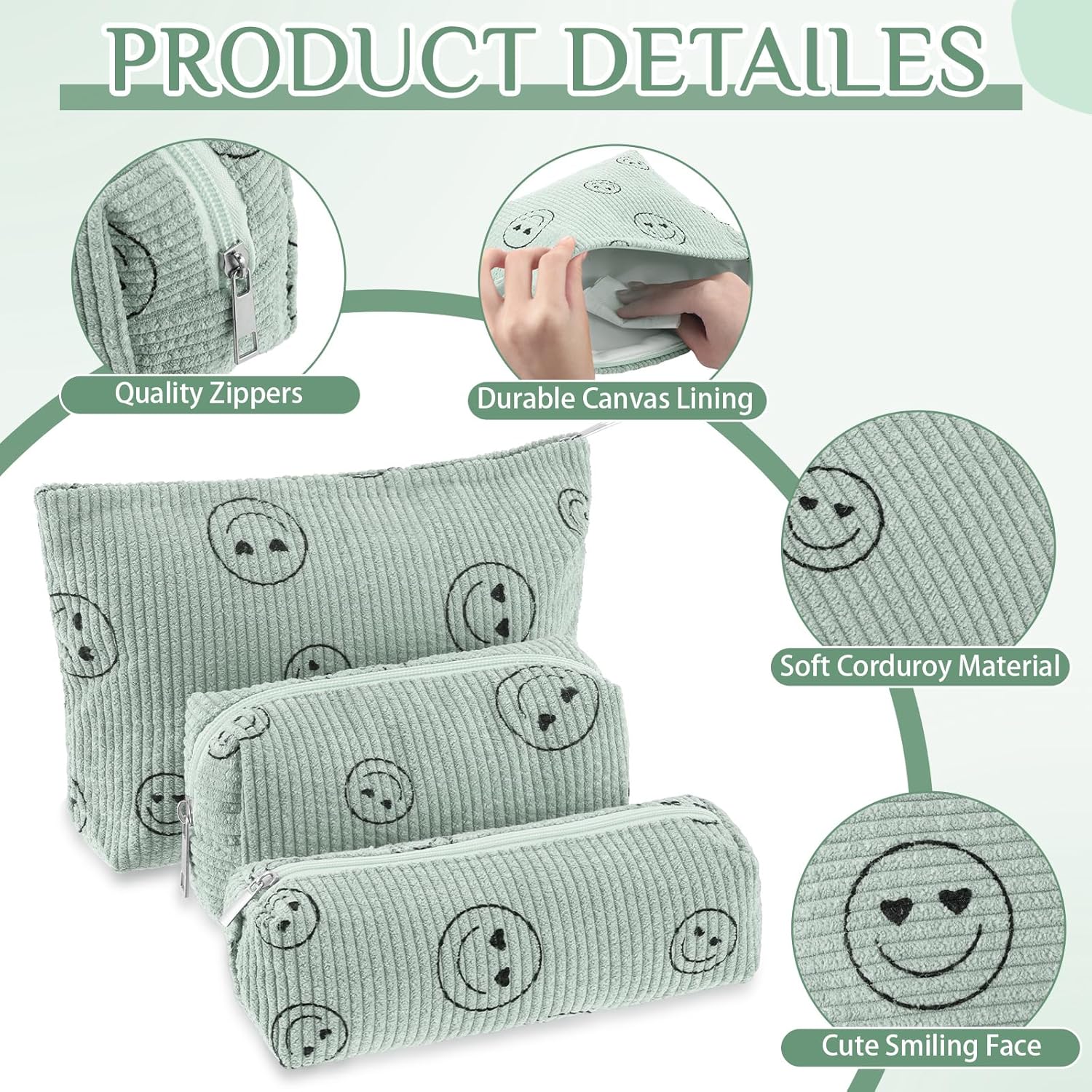 3 Pcs Makeup Bag Set for Women Corduroy Cosmetic Pouch Aesthetic Smile Travel Toiletry Bag Cute Purse Pouch Pencil Case Makeup Brushes Storage Organizer for Christmas(Green,Smile Face)