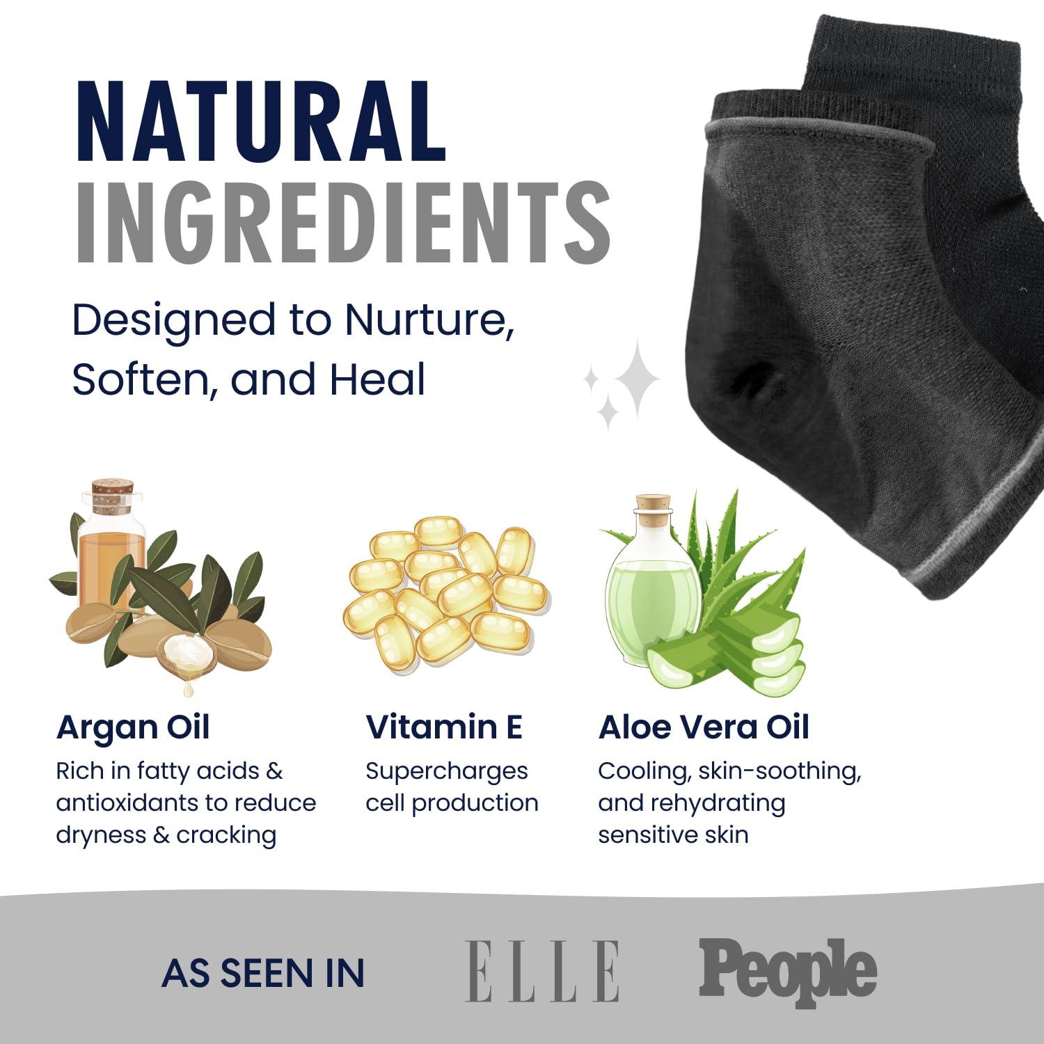 - Find Your Perfect Color Match: Our Moisturizing Heel Socks are all designed to soothe and heal your heels, but we offer a full line of options to suit your style. Our tan socks are packed with moisturizing shea butter, while our green socks’ main ingredient is healing aloe. We also offer black socks with hydrating argan oil, blue socks with softening jojoba, and our Original gray color which has our classic comprehensive blend including Vitamin E, Olive Oil, & Essential Botanical Oils.