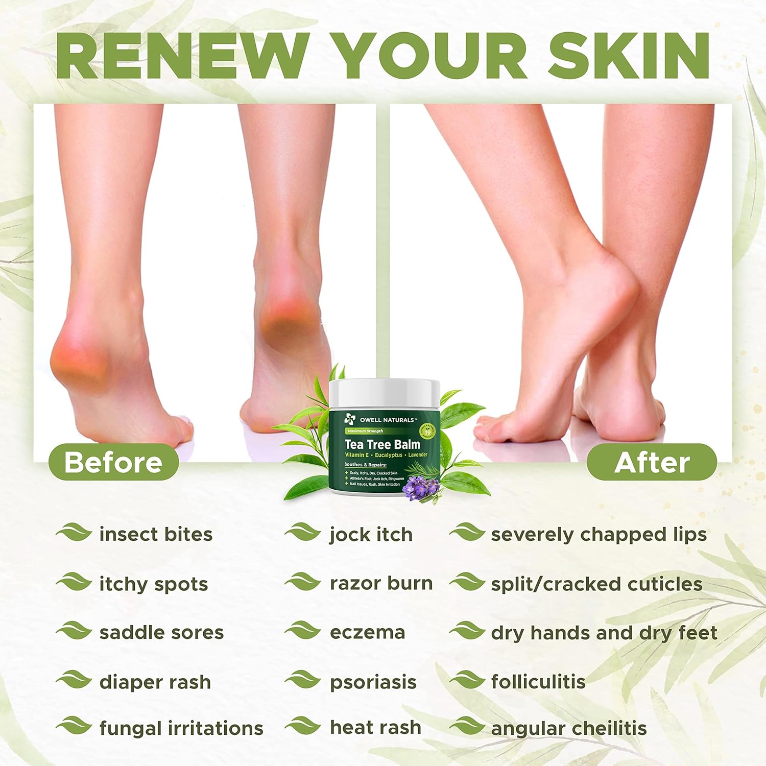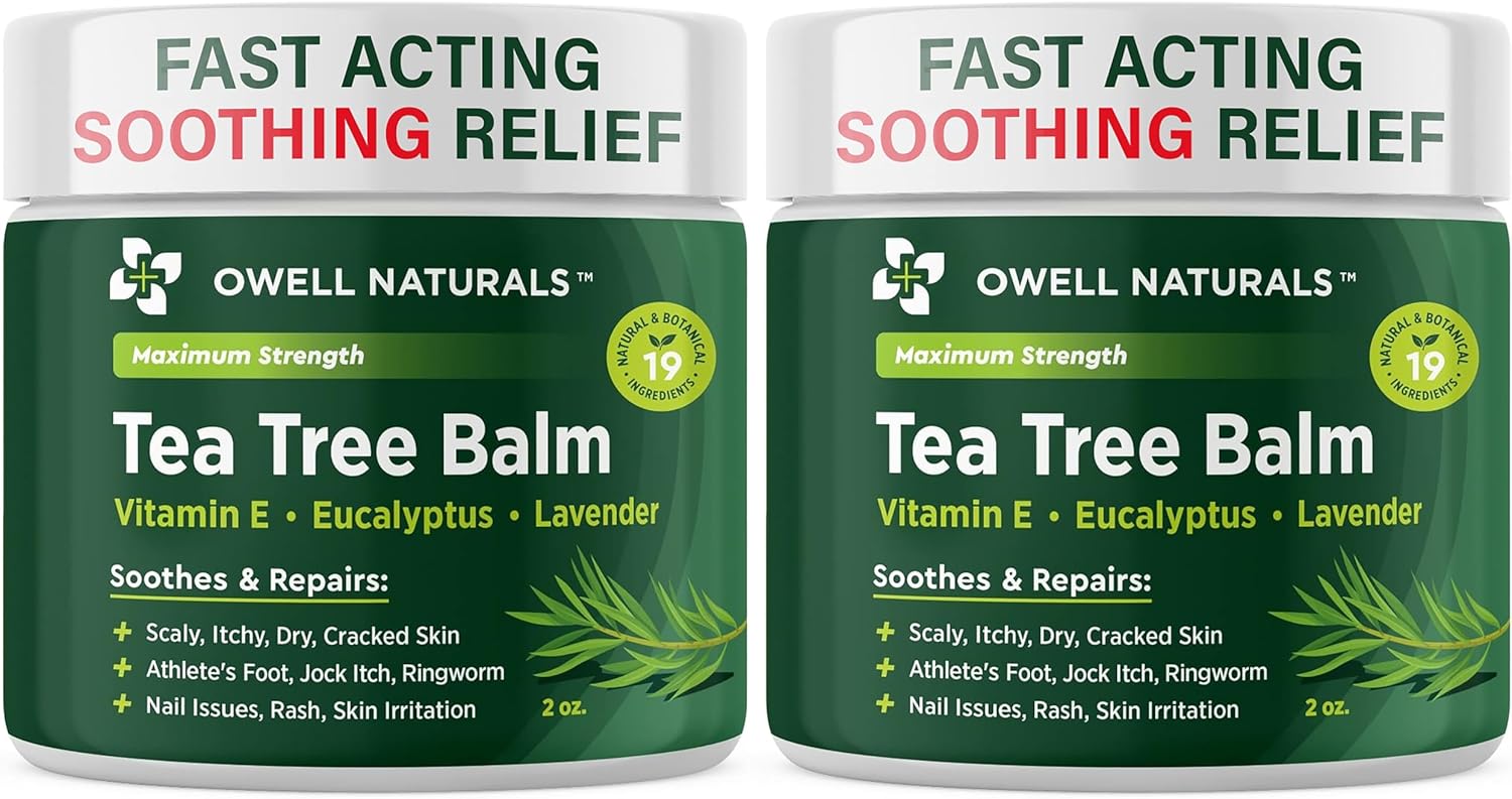- Tea Tree Balm Balm Soothing Itch Relief Ointment, it is gentle on the skin and absorbs quickly without leaving a greasy residue, making it suitable for daily use on all skin types. Owell Tea Tree Balm for Athletes foot, cracked heel, antifungal.