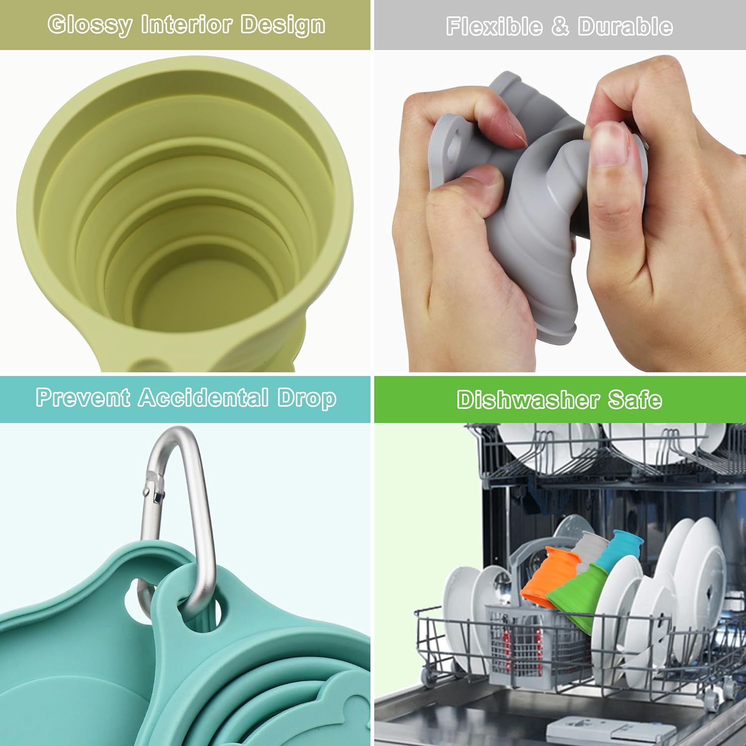 - đź’§Upgrade & Thicken: Folding cups are made of food-grade silicone, BPA-free, non-toxic, odorless, durable, reusable. Heatproof from -40F to 446F, silicon cups are built to safely accommodate warm coffee as well as ice-cold beverages.