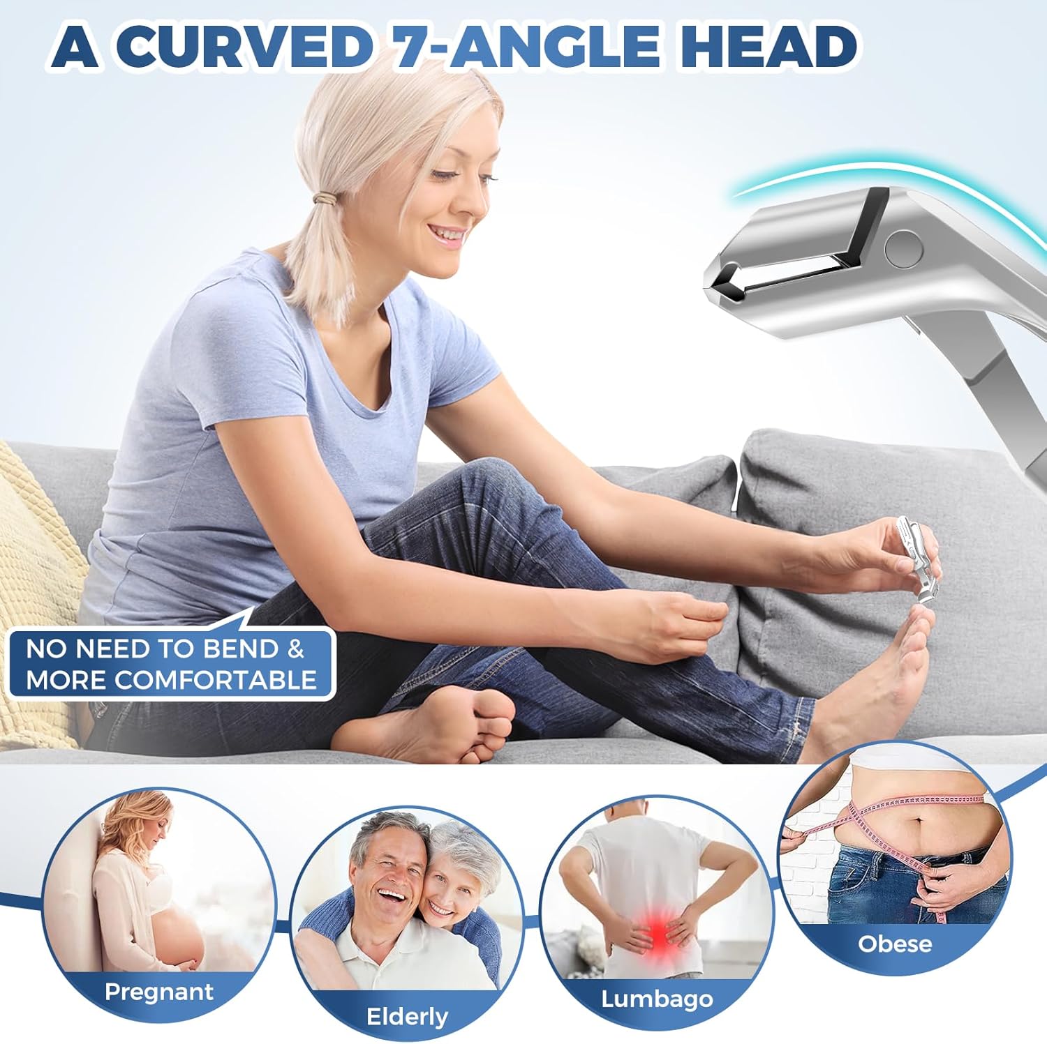 - 【No Need to Bend & Effortless Trimming 】The Toenail clippers for seniors adopts an ergonomic design with a curved 7-angle head, which allows you to clearly see the edge of the blade and the nails, so that you can cut nails accurately and confidently, no longer need to twist and bend your body when cutting toenails. Toenail clipper is suitable for use for all generation people , pregnant and people who has low back pain or arthritis in your hands