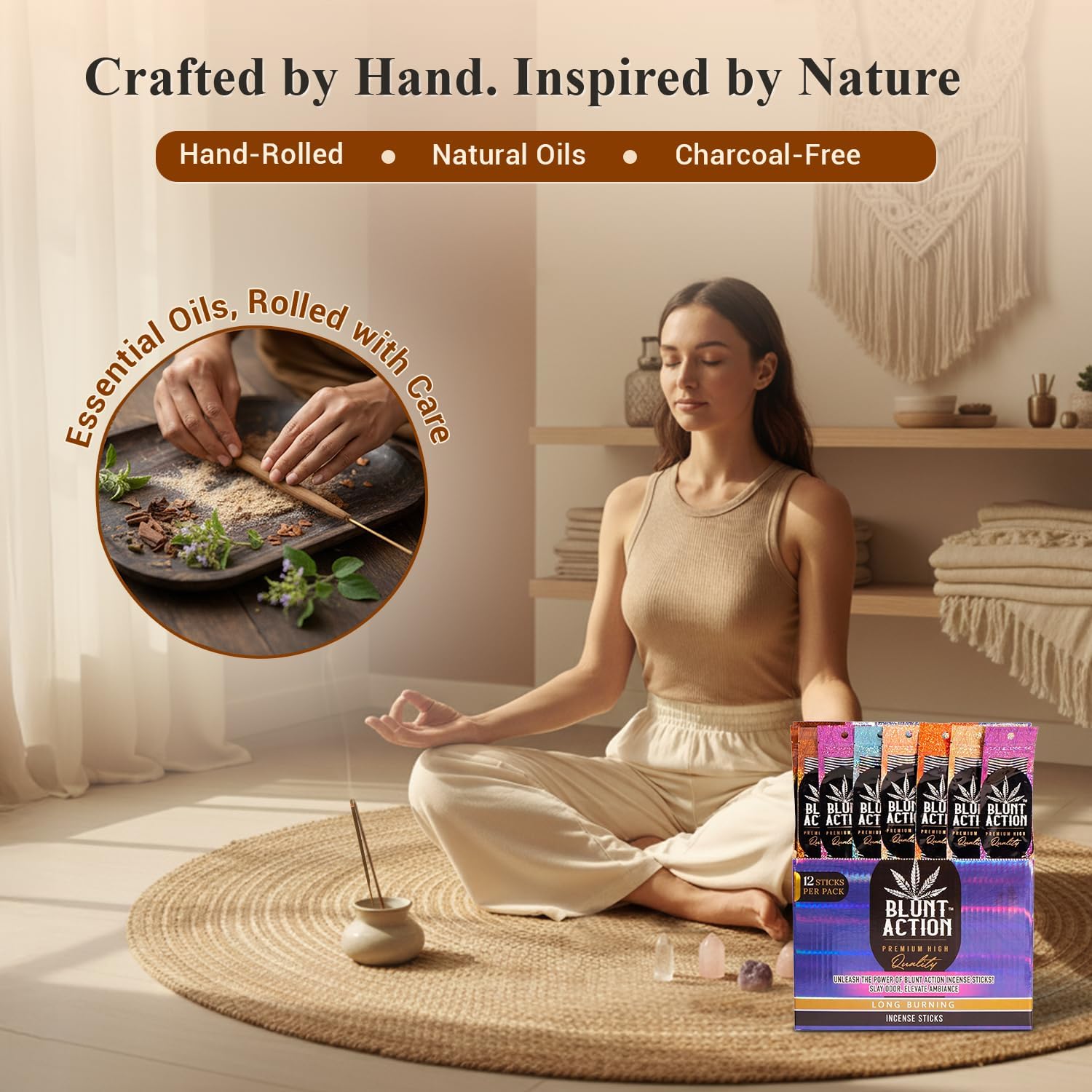 Tulasi Blunt Action Incense Sticks, 12 Packs, 144Pc, Long Lasting Fragrance, Natural Essential Oils Hand Rolled Incense Sticks for Aromatherapy, Relaxing, Yoga, Meditation, Prayer