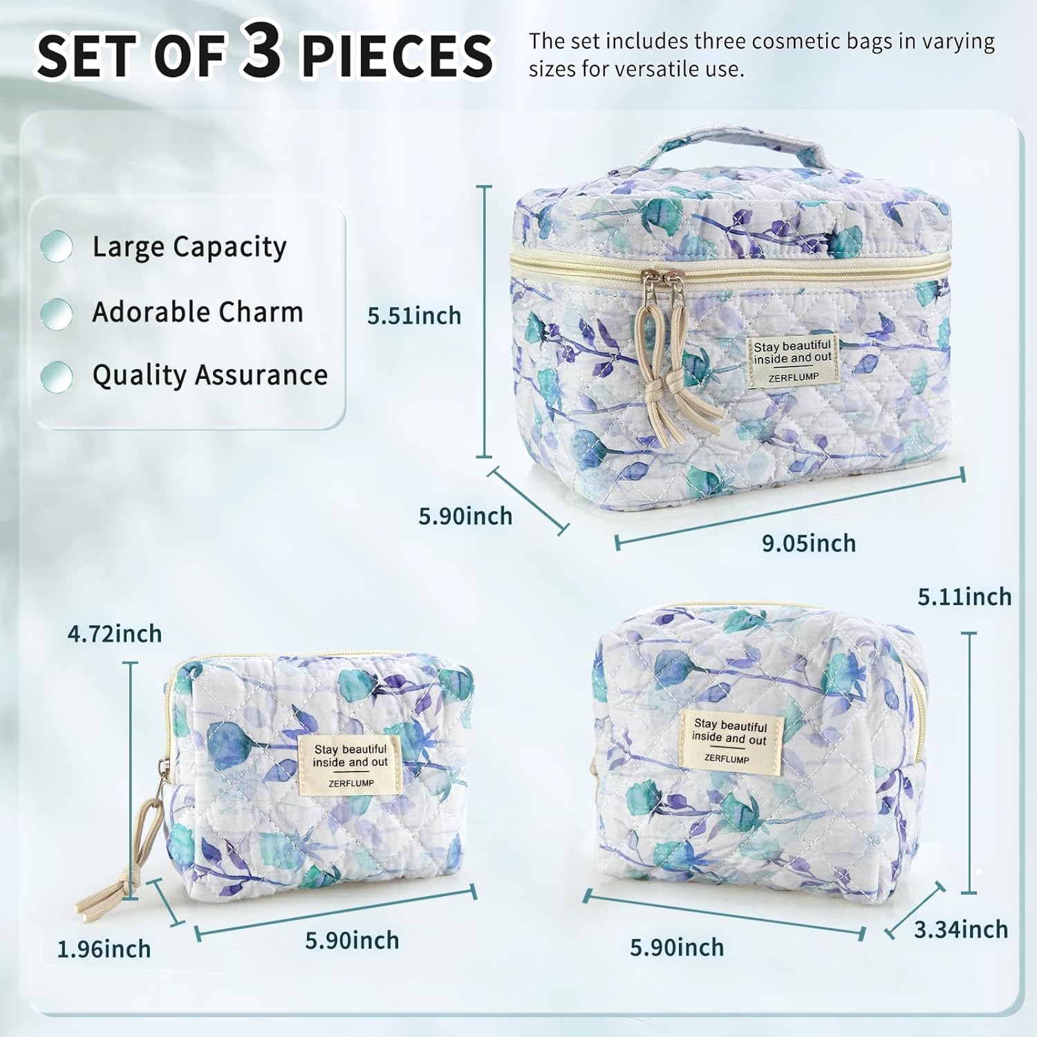 Cute Quilted Floral Makeup Bag(3Pcs),Coquette Aesthetic Cosmetic Bag,Travel Toiletry Bags, Kawaii Aesthetic pouch for Women (2 - Long Branch Flower)