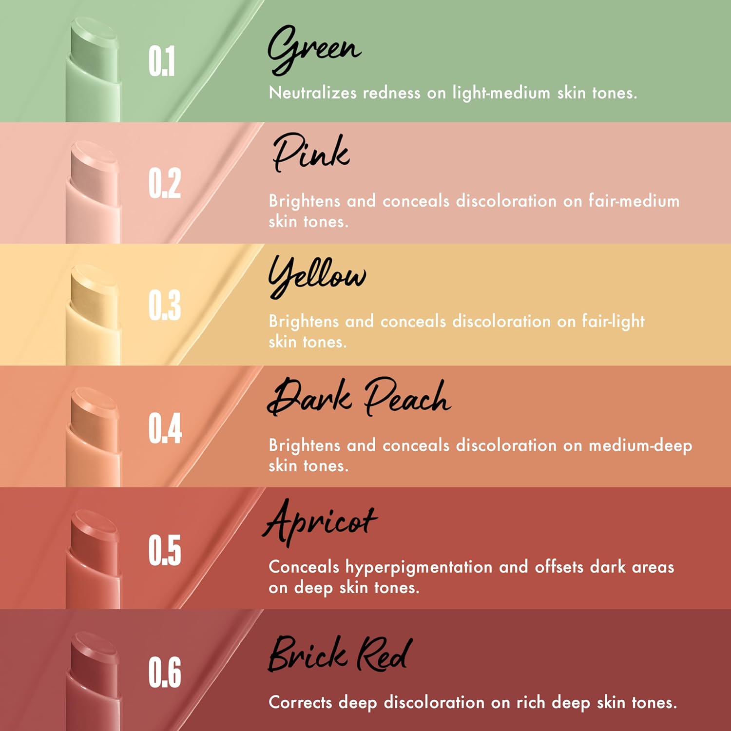 - Color Correcting Made Easy: Our 6 color correcting concealer shades for all skin tones and 18 complexion concealer stick shades help conceal & brighten like a pro. Fix dullness, redness, blemishes, dark spots, undereye circles, and discoloration