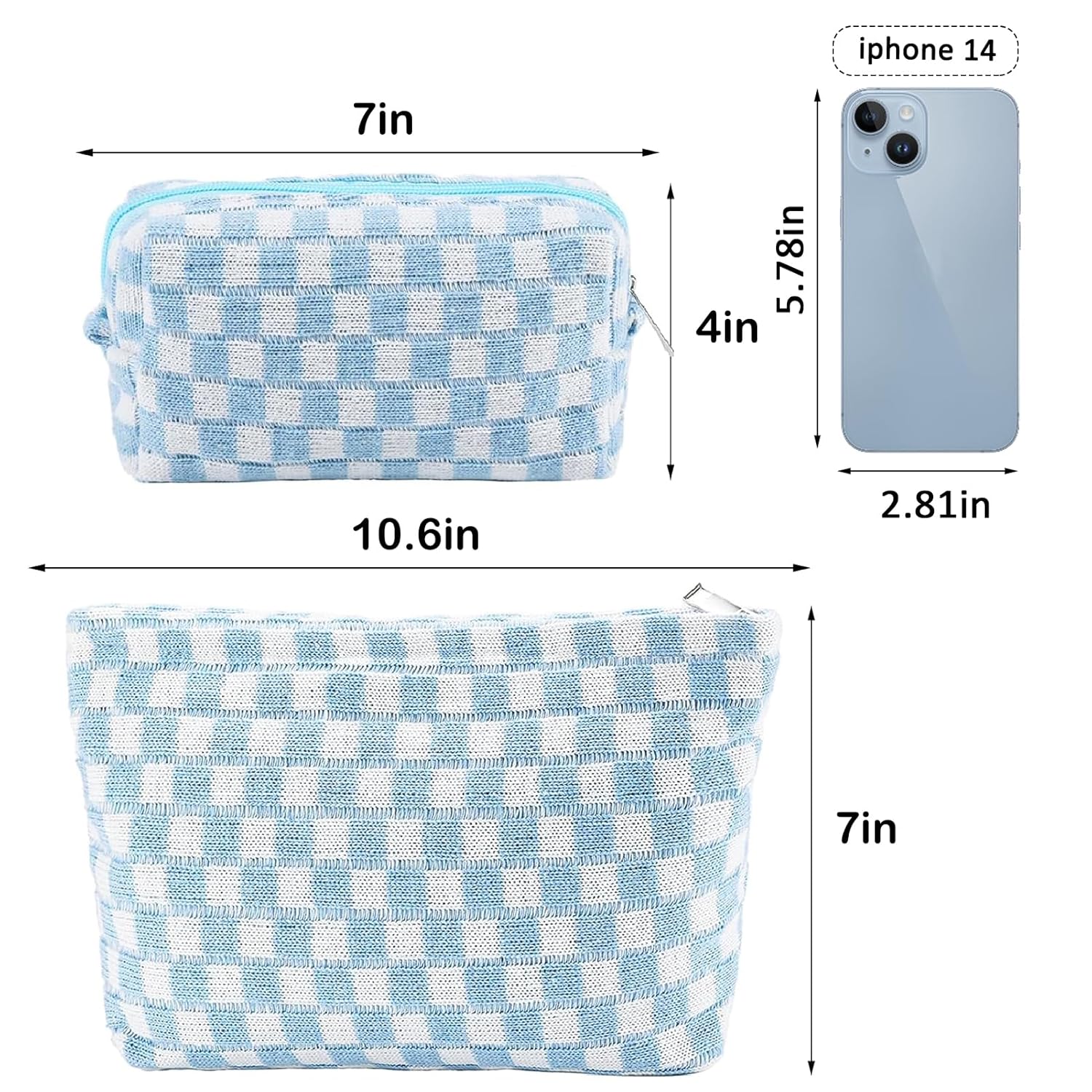 - LIGHT WEIGHT AND EXCELLENT WORKMANSHIP: The cute makeup pouch is made of soft knitted fabric and is comfortable, soft and lightweight. Checkered travel make up bag folds up when not in use and fits in a large bag without taking up space. The metal zipper of the cute pencil case keep your items secure and organized inside. Cosmetic bag accessories set for women