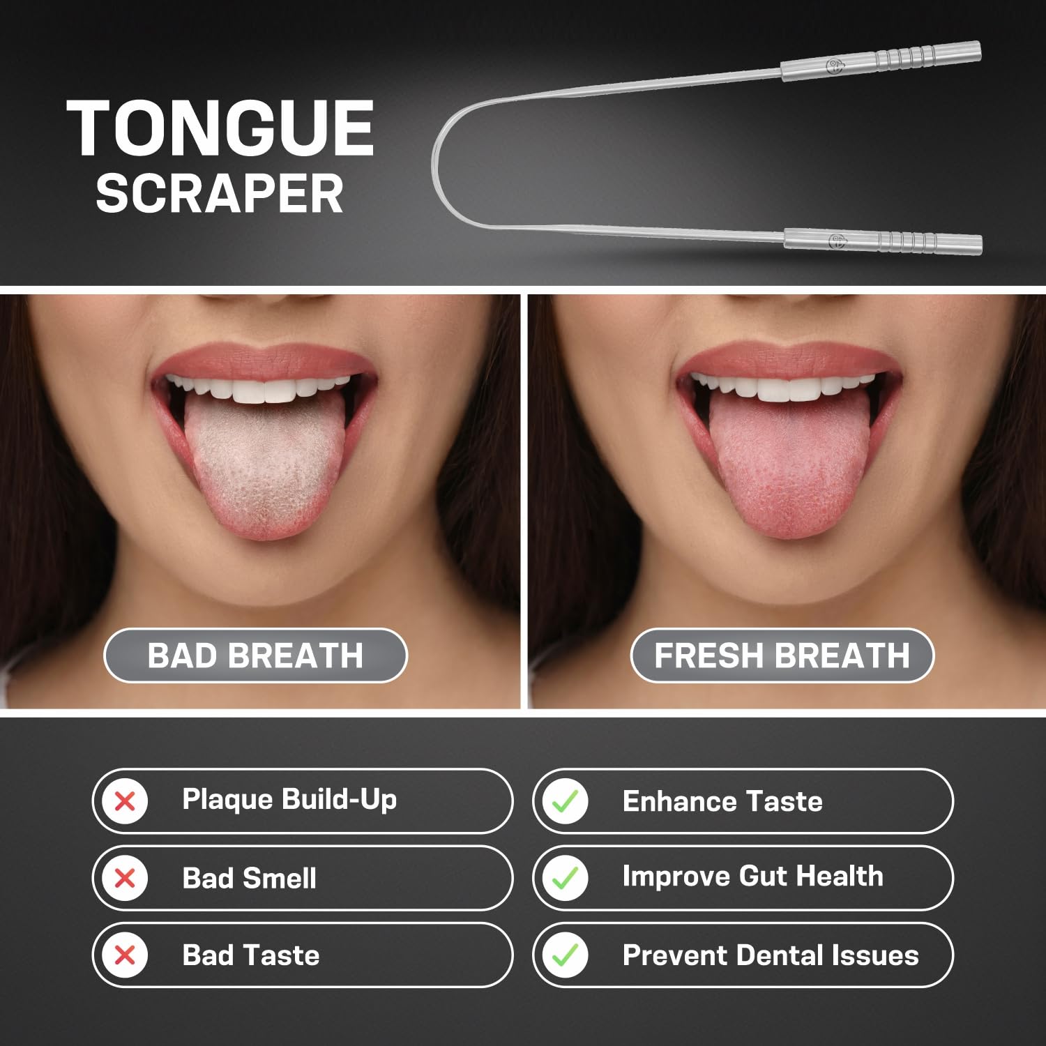 - UNLEASH FRESH BREATH: No more bad breath. Relish the power of fresh breath! Our tongue scraper removes the hidden plaque, and food particles responsible for odors. Get closer to people with a confident smile.