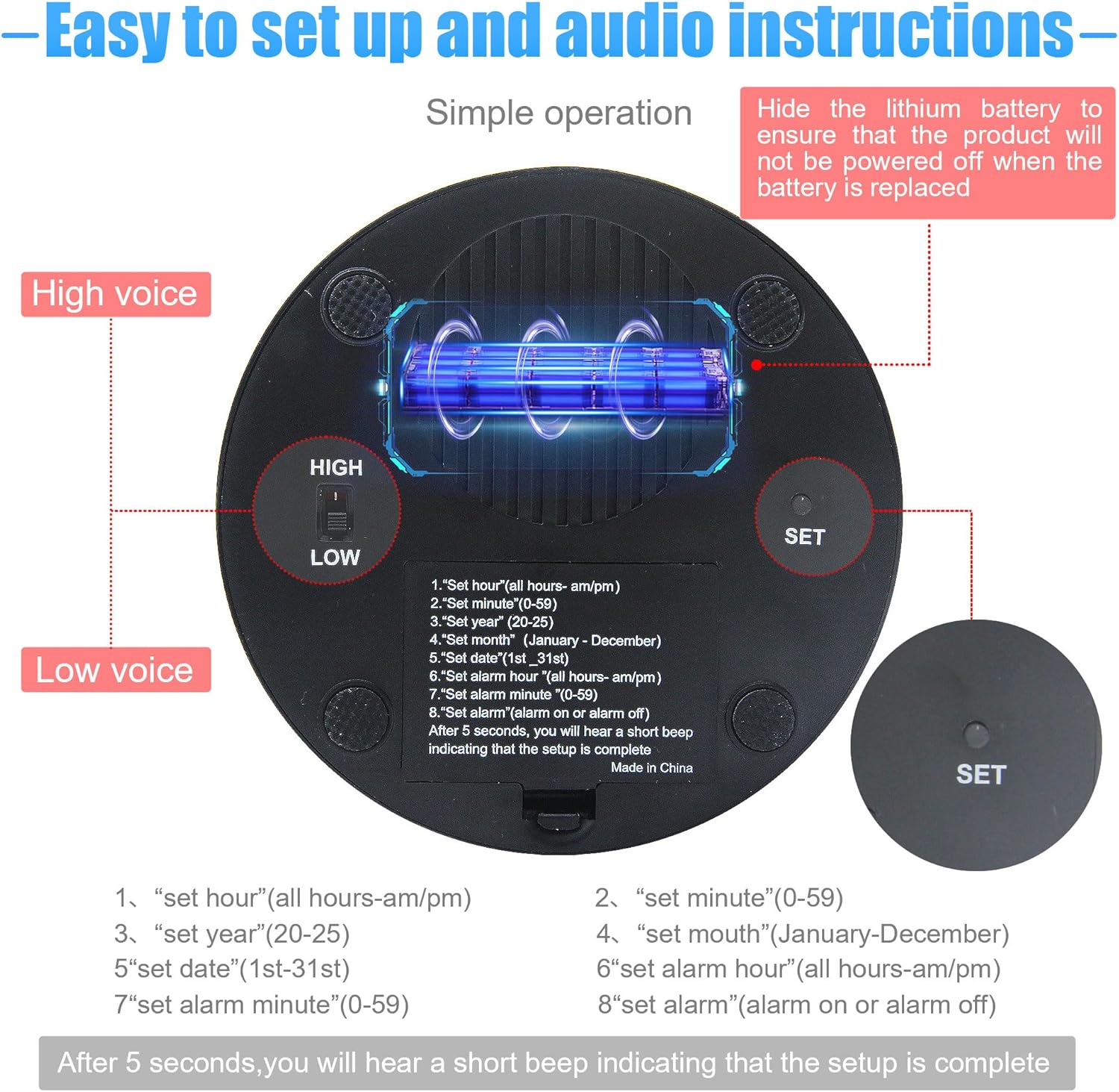 - ★Idea Gift: While this alarm clock is a good choice for anyone, it is ideal for those who are blind or who have low vision, such as the elderly. This talking clock is easy to set and a breeze to operate.Just press the big button and this audible clock will tell you the time, press it again and it will tell you the date and day of the week. When the alarm goes off, press the big button to stop the alarm. The setting button is at the bottom to prevent accidental setting, YOU CAN DIRECTLY PRESS THE +/- KEY ON THE BOTTOM TO ADJUST THE VOLUME.