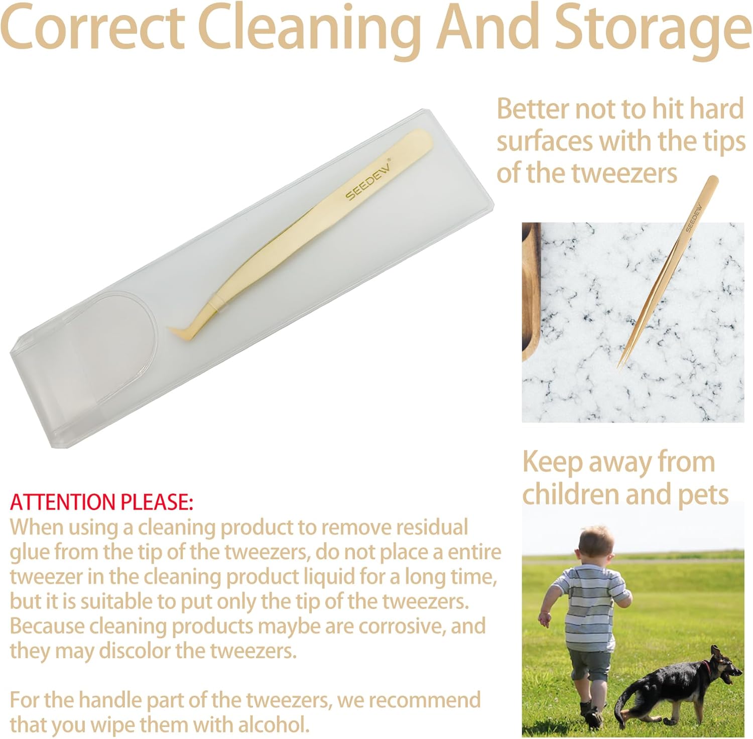 - ⭐【Premium And Classic】SEEDEW stainless steel golden tweezers have texture, smooth surface, classic and elegant style. 1 piece tweezer is equipped with a protective case, which is safe for storage, dustproof, dropproof, and imitation of poking.