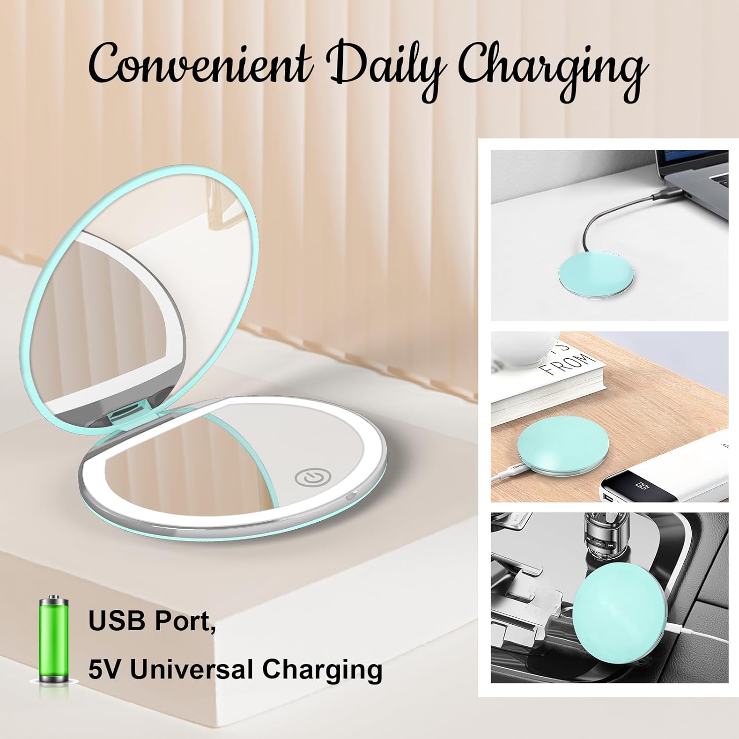 Compact Mirror with Light, 1X/3X Magnification LED Pocket Mirror with USB Data Cable,Mini Mirror for Purse, Pocket,Travel and Present (Mint Green)