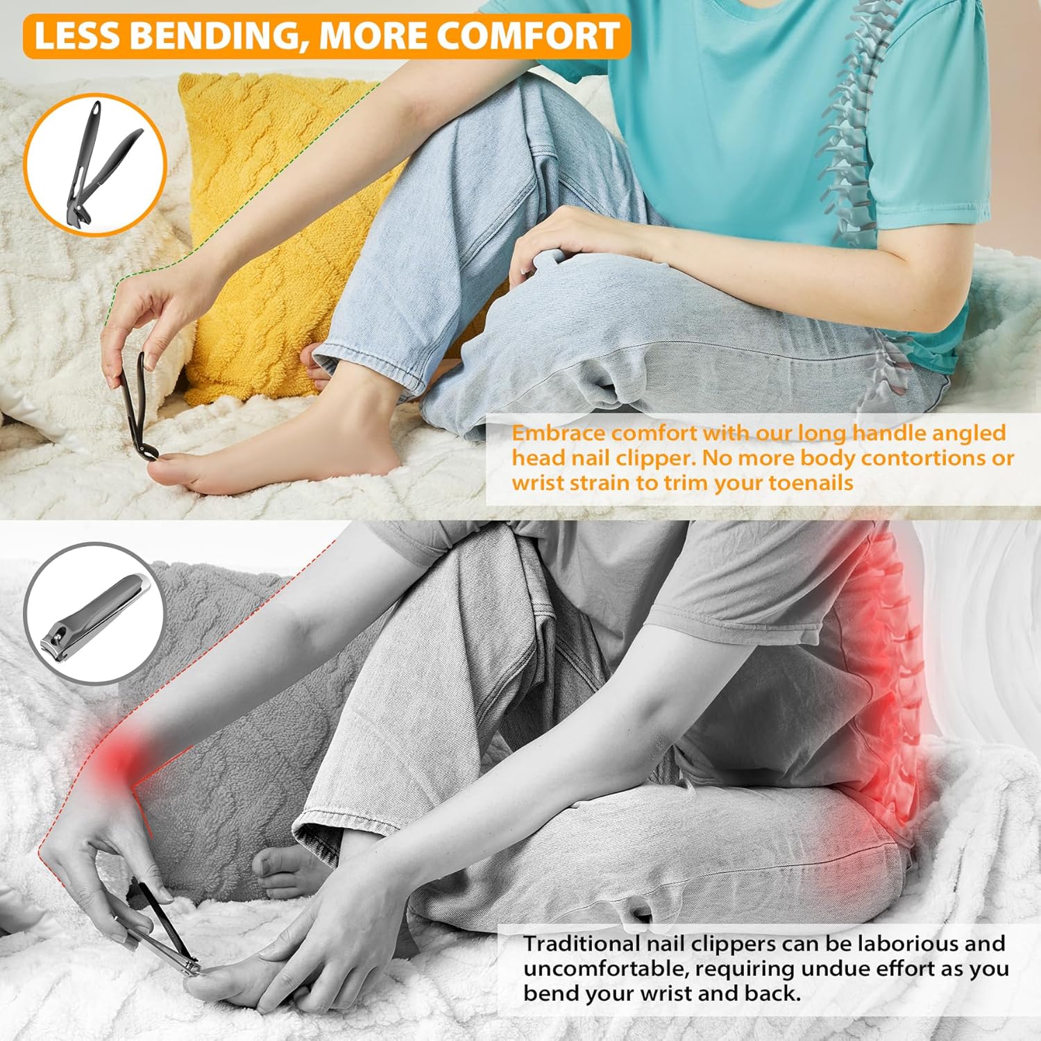 - 【Enhanced built-in spring & Extended broad and lengthy handle】Trim like a pro with our Precision Nail Clippers - Nail care made effortless. Our expertly crafted nail clippers boast an ergonomic design, engineered for seniors, allowing for clear visibility of every detail, ensuring precise and confident nail trimming. Say goodbye to awkward body contortions – our innovative design offers less bending and more comfort!
