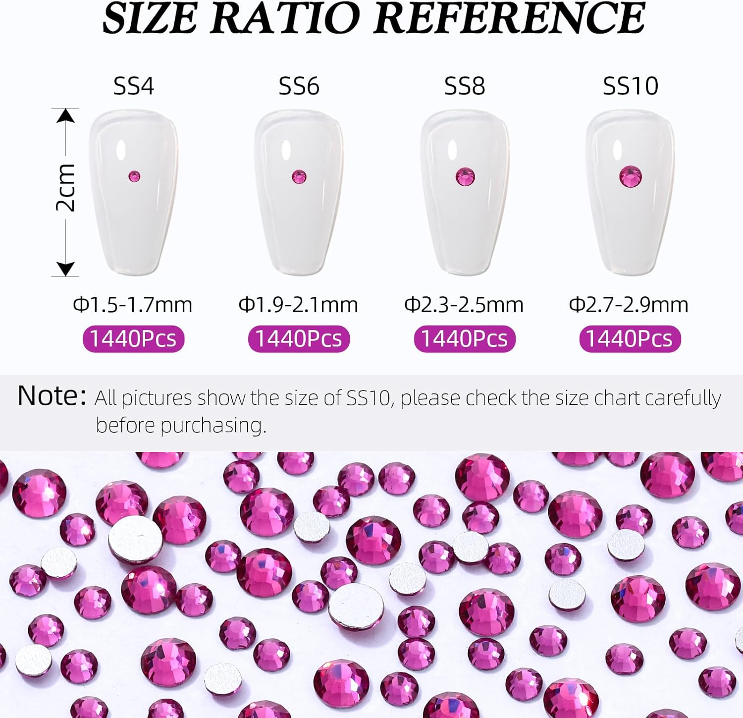 Fuchsia Flatback Rhinestones, Glass Rhinestones for Nail Art and Craft, Glue Fix, Loose Crystal Gemstones(Fuchsia, SS4, 1440pcs, 1.5-1.7mm)