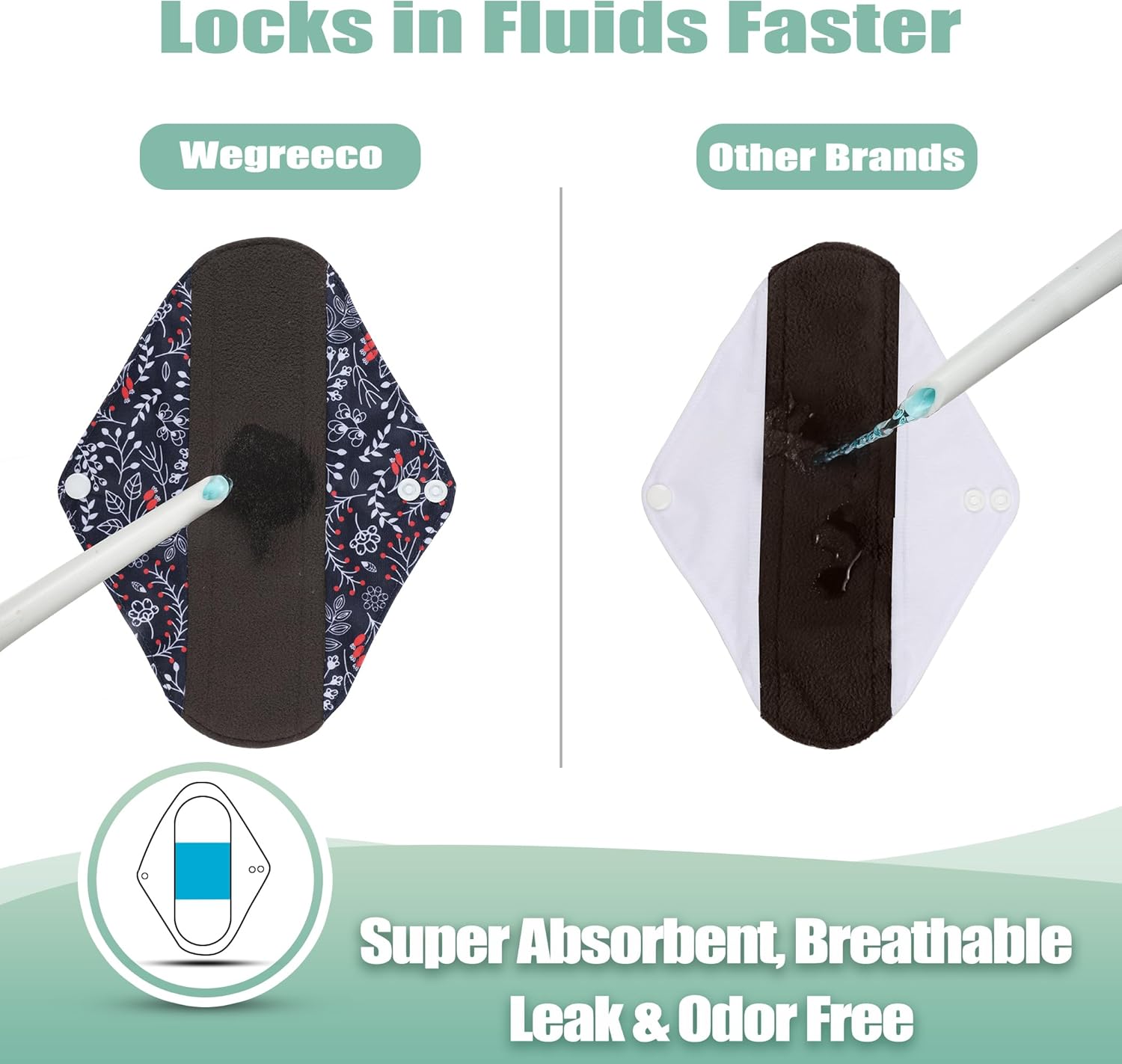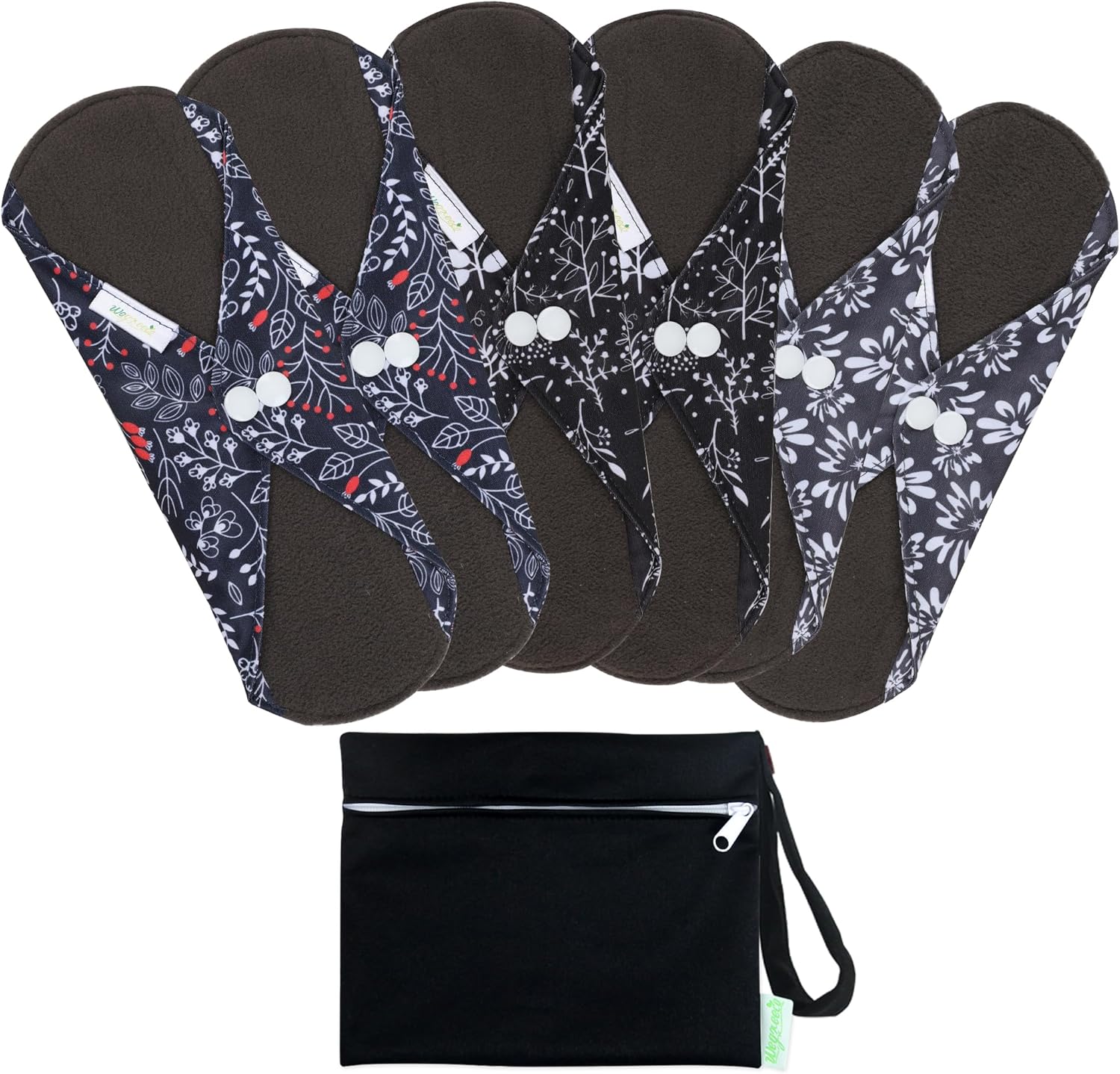 - CHARCOAL INNER LAYERS of these cloth menstrual pads is soft with maximum and have a stay dry surface.The dark color is forgiving of stains and Not only great at soaking up liquid, smells are neutralized.Middle layers microfiber make this reusable sanitary napkin super absorbent and a new trend in baby cloth diapers too.