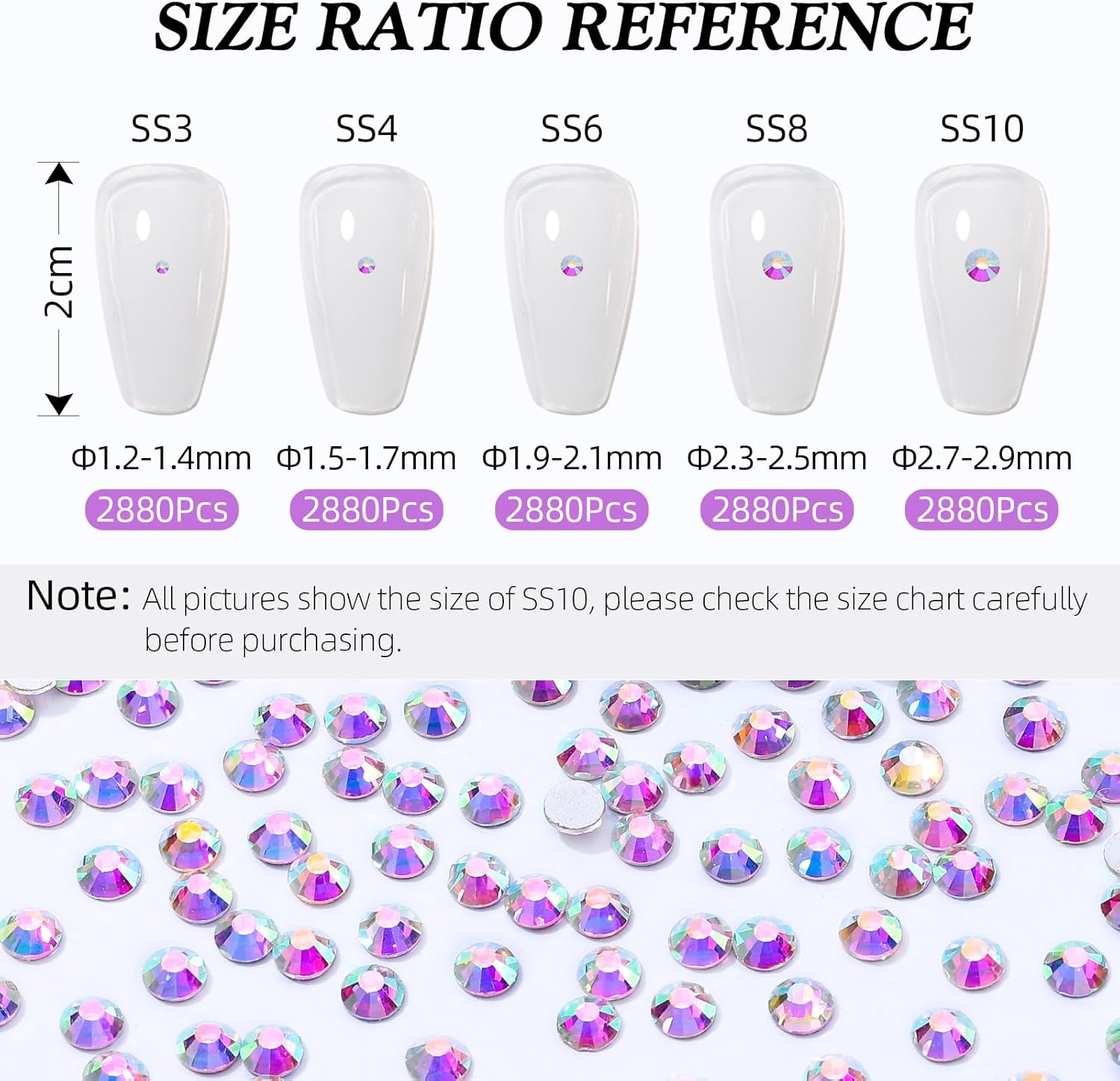 Crystal AB Flatback Rhinestones, Glass Rhinestones for Nail Art and Craft, Glue Fix, Loose Crystal Gemstones(Crystal AB, SS8, 2880pcs, 2.3-2.5mm)