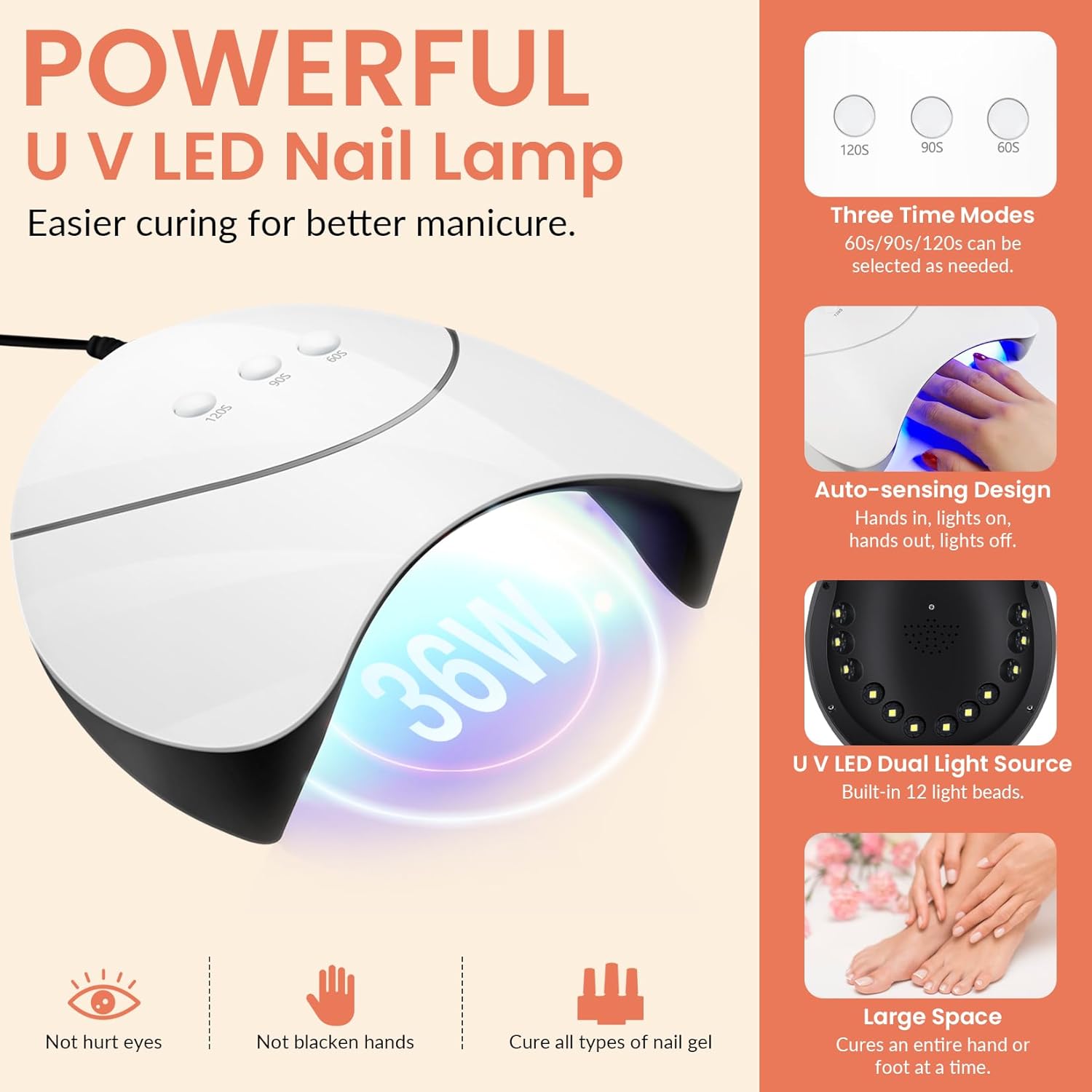 - 【Professional U V/LED Nail Lamp】 Professional nail light in this gel nail polish kit has three time options: 60s/90s/120s, and automatic sensor design, allowing you to easily control the curing of gel nail polish. U V/LED dual light source design, with 12 lamp beads, can efficiently cure almost all kinds of nail gels, not hurt your eyes, not black hands. Enough space to cure a whole hand or foot, bring you high quality nail art curing experience.