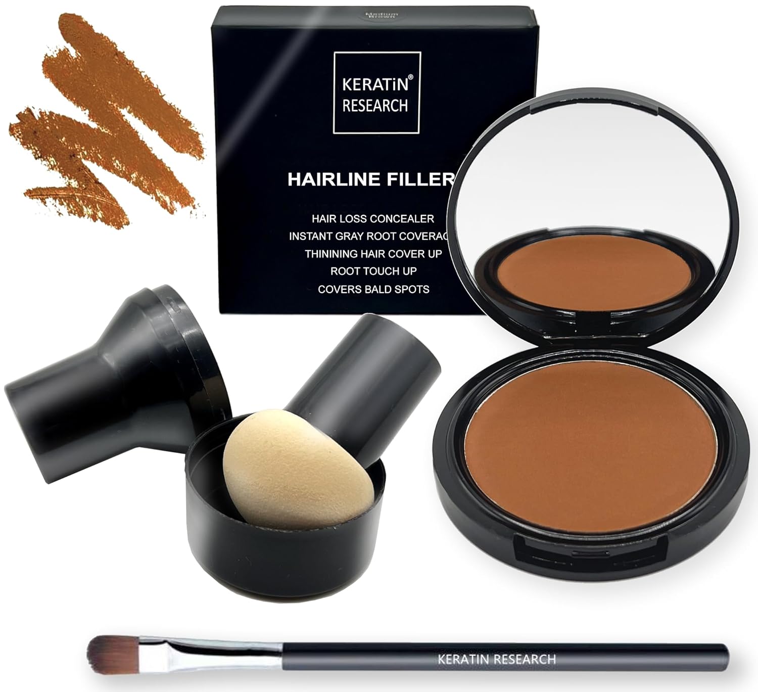 - ROOT CONCEALER- Keratin Research Hairline Filler, a Premium Root Cover Up, is your secret weapon for at home or on-the-go. Camouflage roots and grays instantly, giving you full great looking hair! The Cover Up Powder also conceals thinning hair and hair loss, for an instant look of healthy volume. Packaging includes a large mirror and a great mushroom applicator. Root touch up powder is resistant to rain, sweat, and wind.