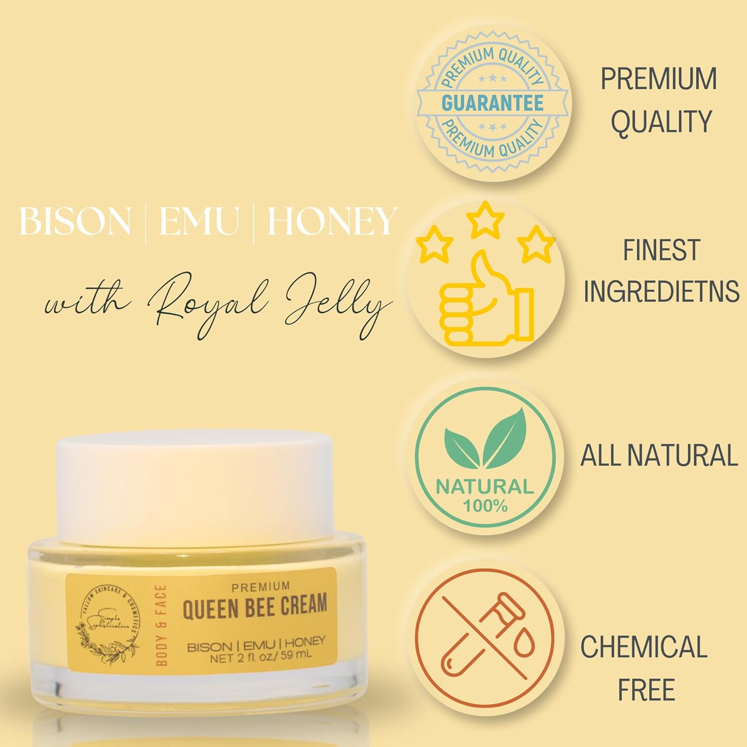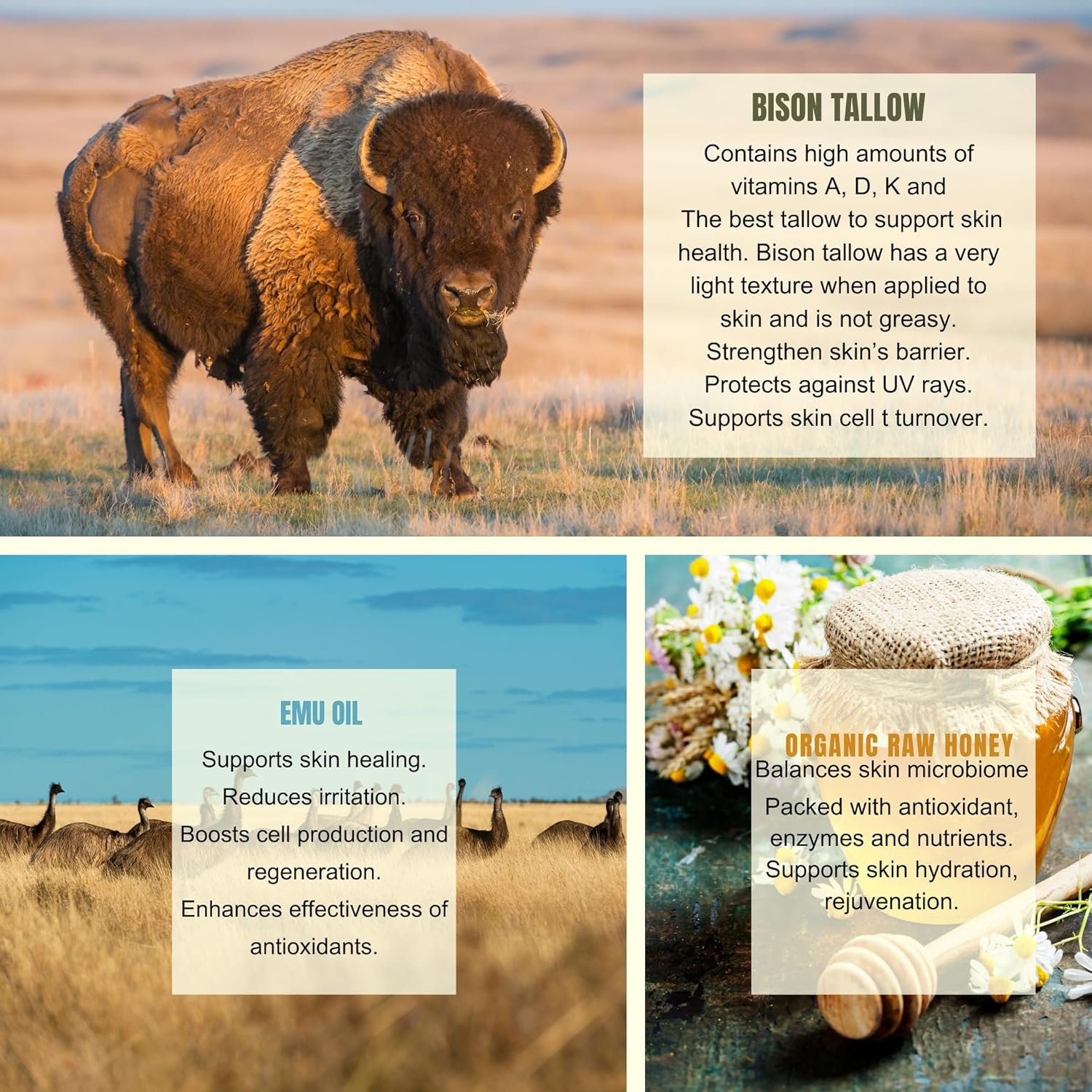 - MOISTURIZING: Our balm combines three all natural ingredients, grass-fed bison tallow, emu oil, and royal jelly into a straightforward, but sophisticated cream for everyday skincare. These traditionally used moisturizers work together to deeply penetrate and rejuvenate your skin.