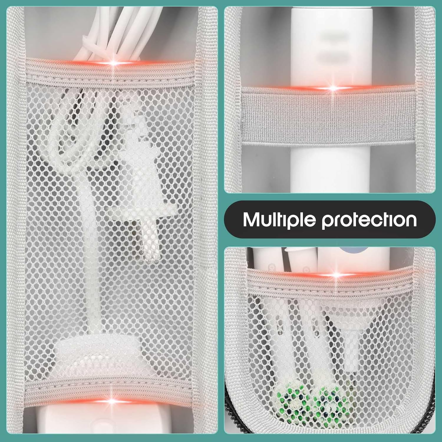 - Compact and Lightweight Design: The main compartment features elastic straps to secure your electric toothbrush, offering protection against shocks and drops. An additional mesh pocket provides flexible storage for power cords, brush heads, toothpaste, and other accessories. The smooth zipper ensures easy opening and closing, enhancing convenience.