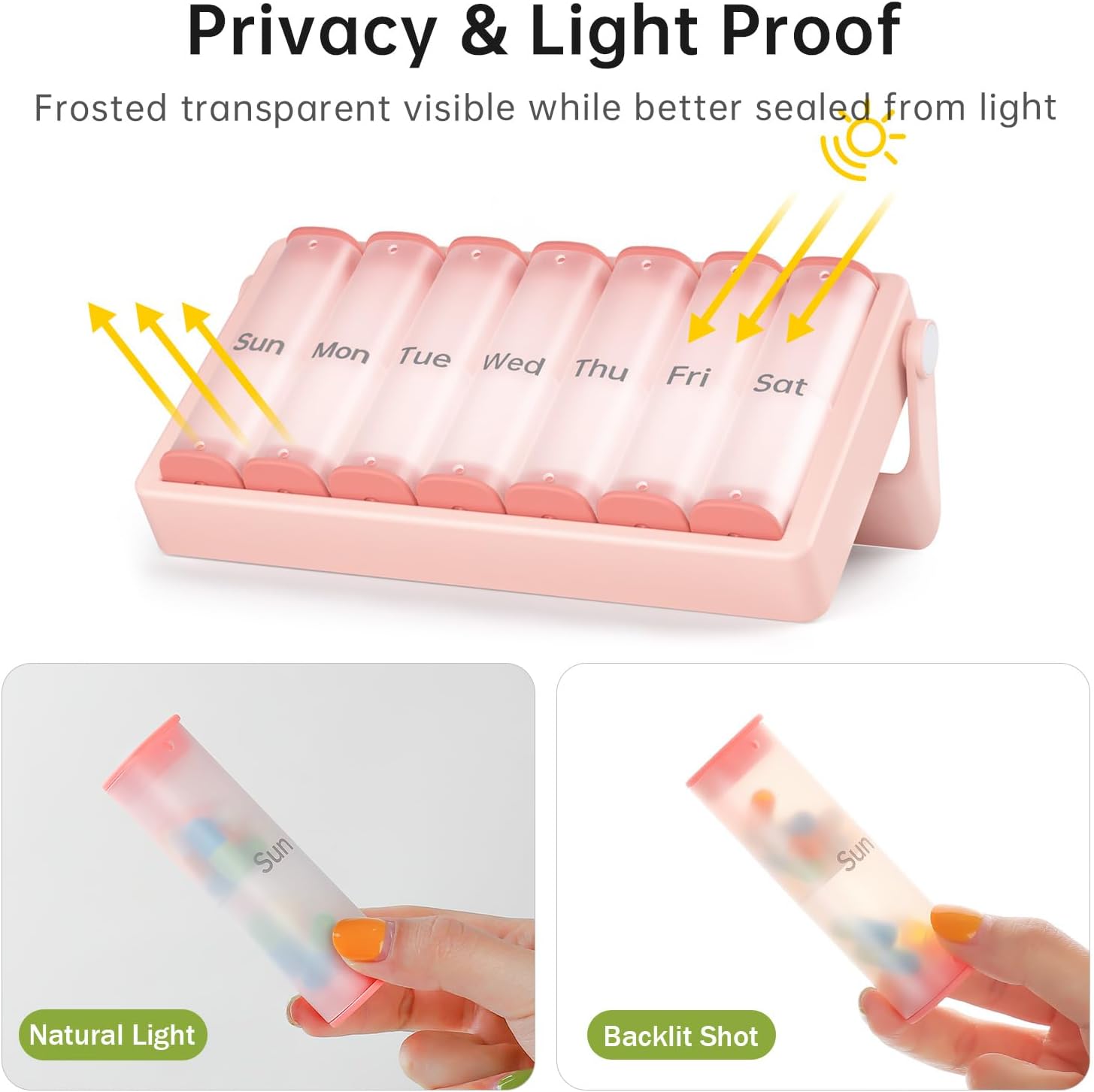 Weekly Pill Organizer 2 Times a Day, KOVIUU Large Travel Pill Box 7 Day, Am Pm Twice Daily Pill Case with Rotatable Handle, Pill Holder Container for Vitamin, Medicine, Supplement, Fish Oil, Pink