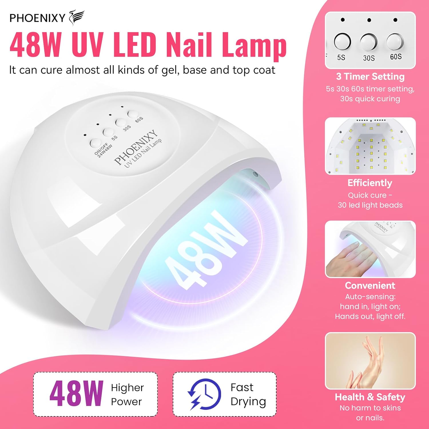 - [48W U V LED Nail Light]: Our auto-sensing 48W LED UV nail lamp contains 30 led light beads to efficiently cure each nail in all directions. Nail Light displays 3 timer settings (5s/30s/60s) to cure all kinds of gel swiftly and safely within 60-90 seconds. No harm to skins or nails.