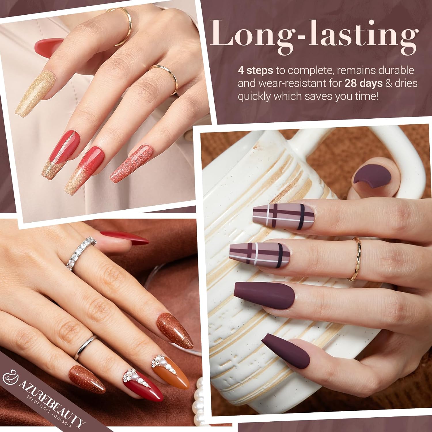 - Superior Quality & Long Lasting: AZUREBEAUTY nail dip powder kit is long-lasting anti-chipping, and anti-peel off. The color is full and natural-looking, light, and has an impeccable shine finish. It can keep the nail art gorgeous and shiny for more than about 28 days with proper application. This makes it the first choice for busy people. (REMINDER: Use 2 to 3 times each time, the effect is best.)