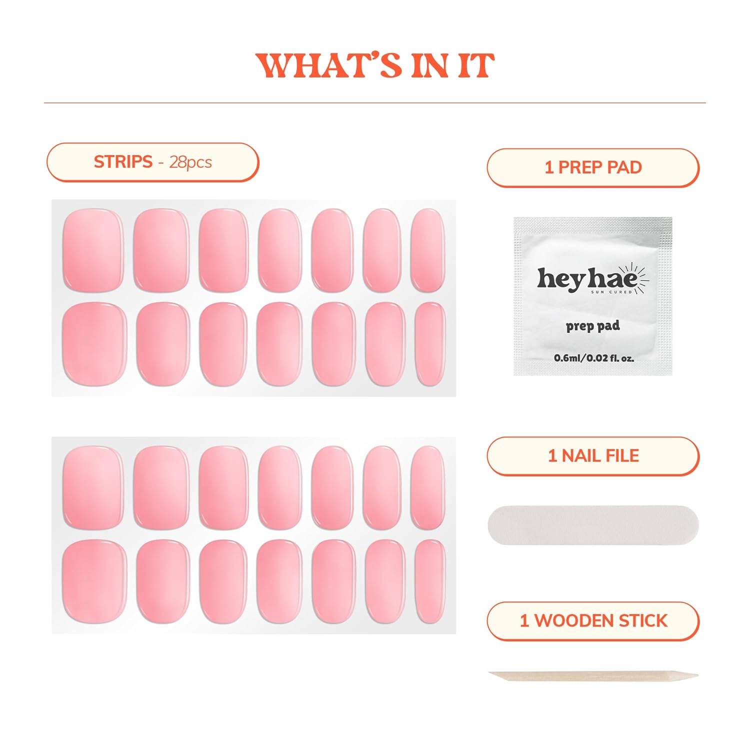Semi Cured Gel Nail Strips | No LED Lamp Needed | Solid, Pink, Spring | Easy Apply & Remove, Salon Quality | Includes 28 Strips, 1 Prep Pads, Nail File & Wooden stick - Hey, Strawberry Picking?