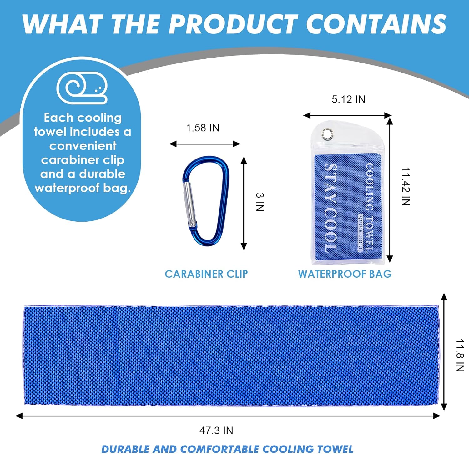 - DESIGN FEATURE & CUSTOMER SERVICE: Cooling towels measure 47"x12" with an extended length designed to adequately cover the neck and face. If you have any problems with your cooling towels, please email us and we will answer your questions quickly and patiently