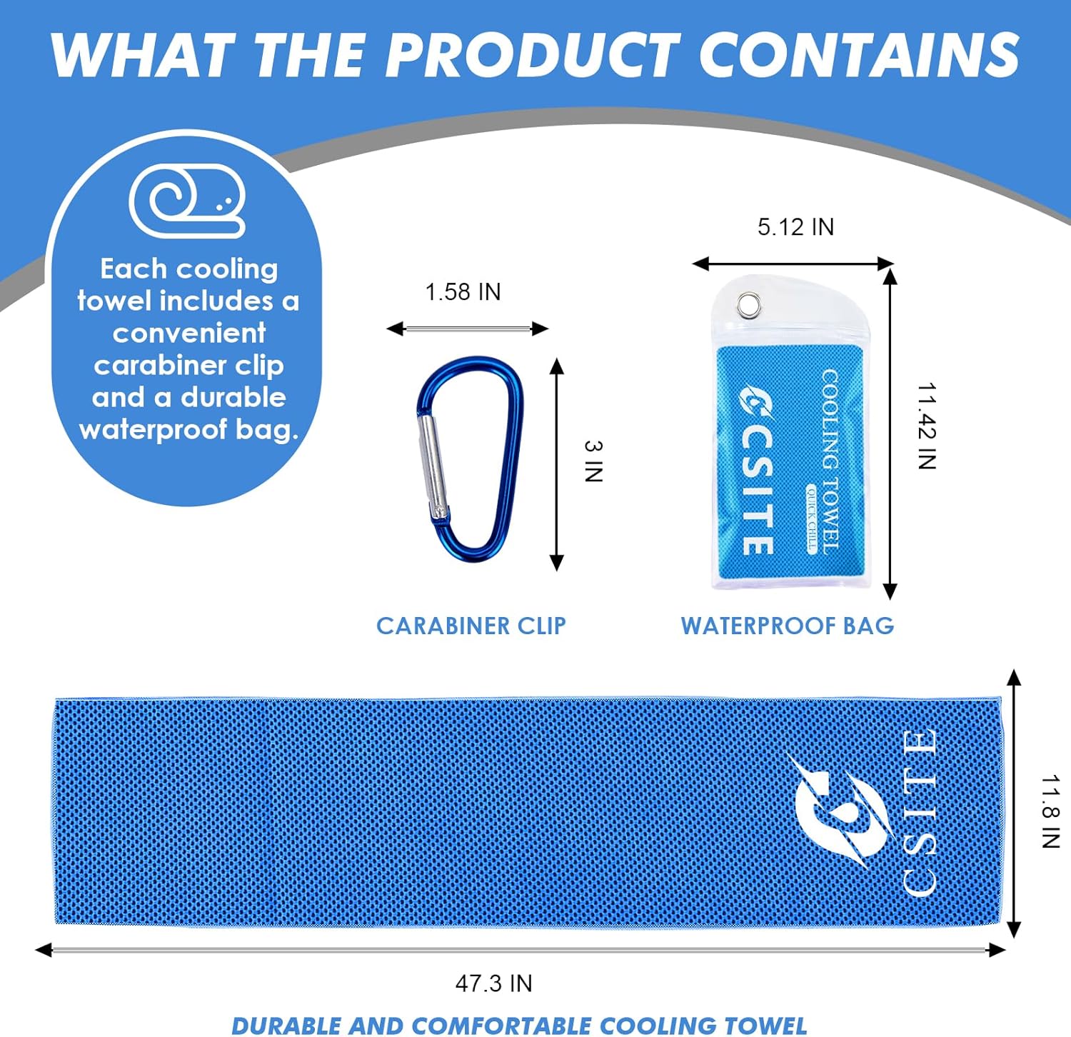 - DESIGN FEATURE & CUSTOMER SERVICE: Cooling towels measure 47"x12" with an extended length designed to adequately cover the neck and face. If you have any problems with your cooling towels, please email us and we will answer your questions quickly and patiently