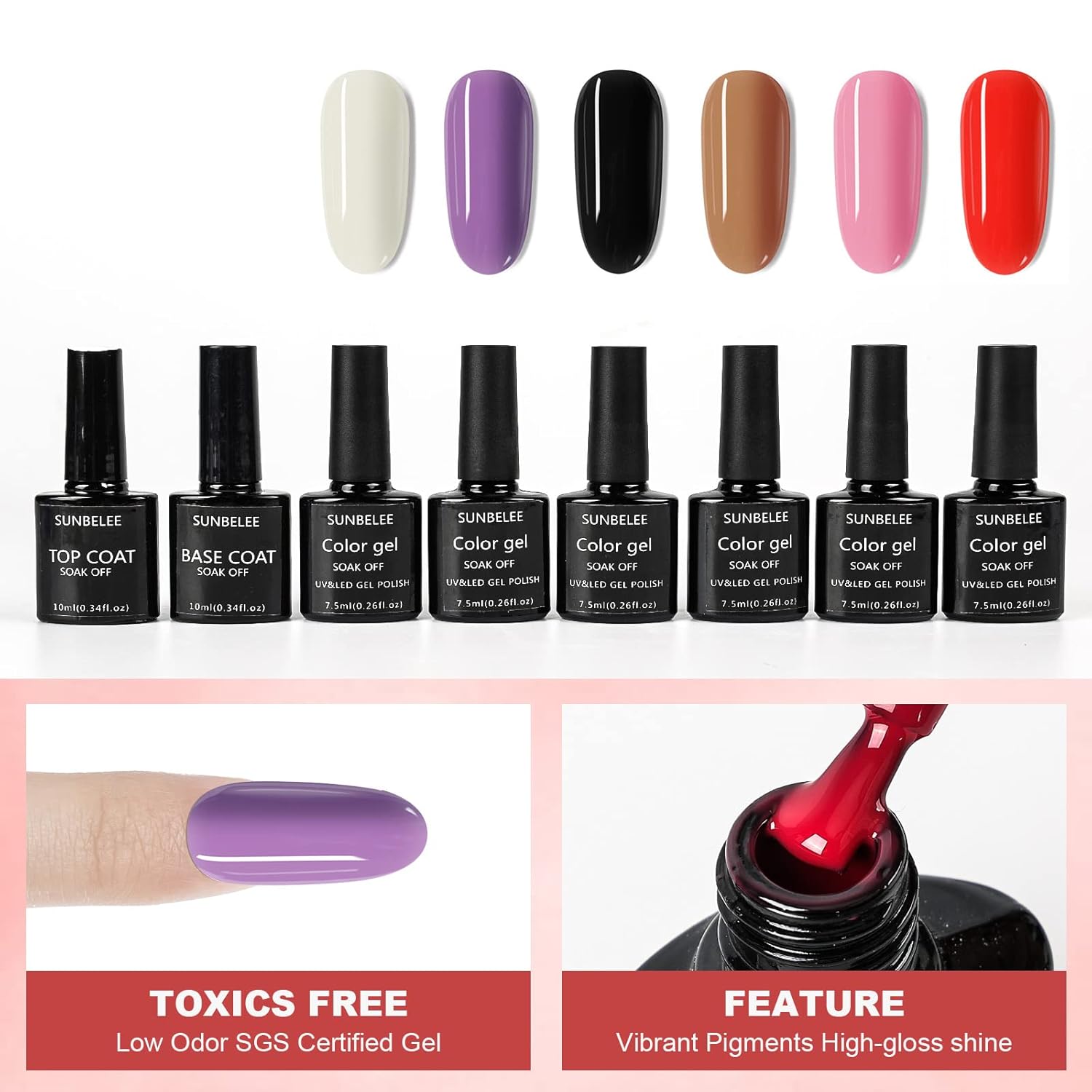 - High-quality Gel Nail Polish Kit: 6 classic colors gel nail polish (7ml each bottle) smooth and easy application, even a nail starter can easily make nail salon-grade effect, Can be used alone or with glitter powder, sequins, glitter brick. A simple operation allows you to obtain beautiful nail tips for long lasting and sparkle effect. Contains base coat and glossy & top coat.