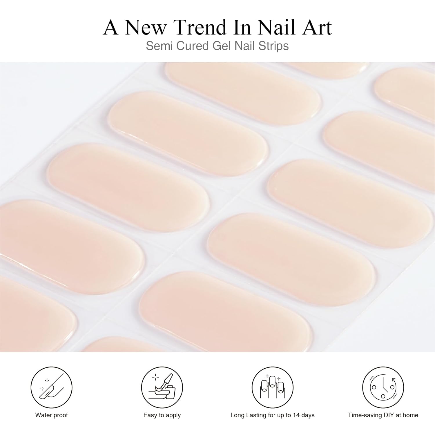 Semi Cured Gel Nail Strips, 20 PCS Gel Nail Stickers Work with UV Light, Salon Quality & Easy to Use - Fresh Cream