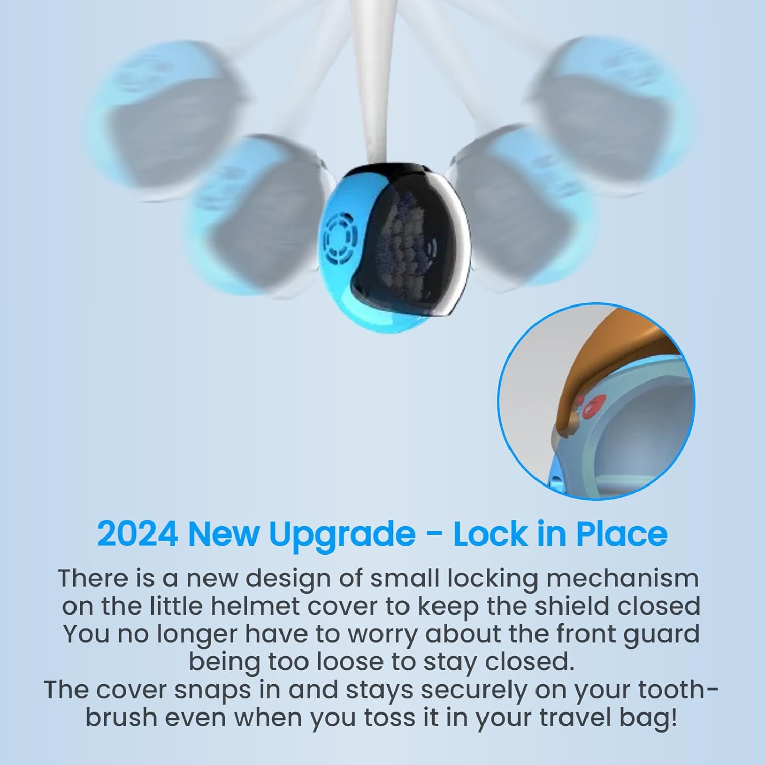 - SAFE LITTLE LATCH TO KEEP IT CLOSED: There is a new design of small locking mechanism on the little helmet cover, The toothbrush cover snaps in and stays securely on your toothbrush even when you toss it in your travel bag.