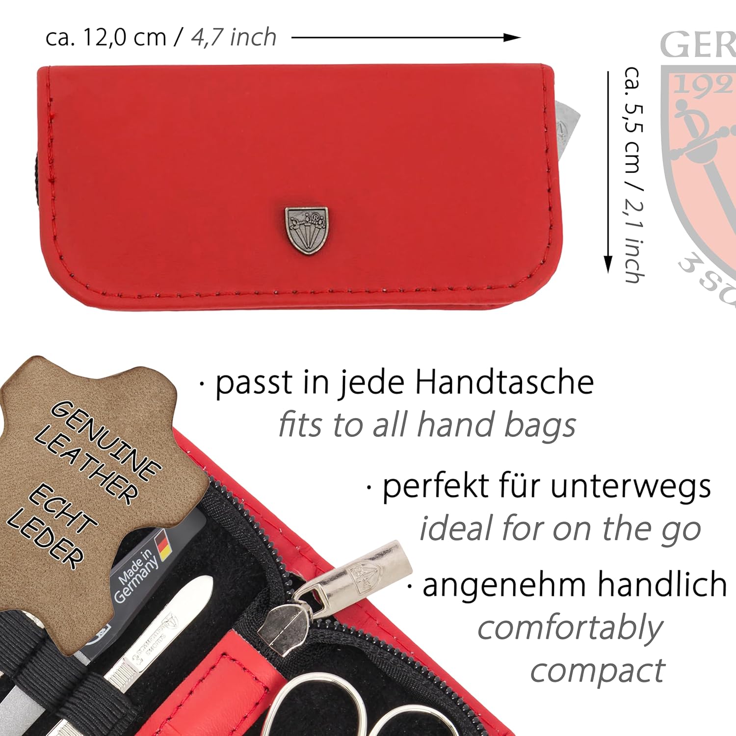 3 Swords Germany - brand quality 5 piece manicure pedicure grooming kit set for professional finger & toe nail care scissors clipper genuine leather red case in gift box, Made in Germany