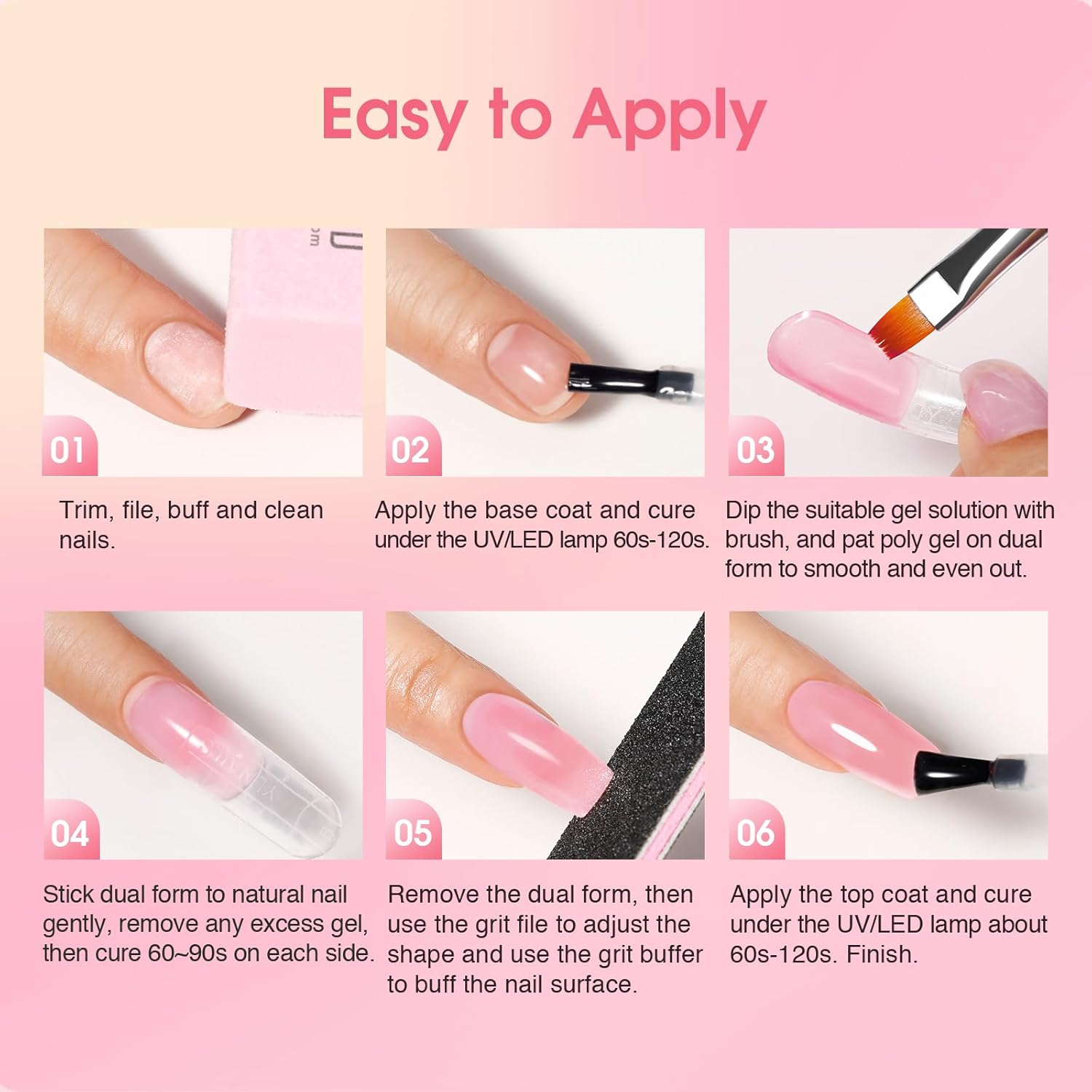 - Warm Tips: It is common for gels to be sticky. so dipping you brush into the gel solution will help you push the gel more smoothly. Or you can seal the gel tube and soak it in warm water before use, which will make it more fluid and help you squeeze out the poly nai gel more smoothly. Both sides of the nail need LED light or UV light to cure for about 120s to completely dry. The lighting time needed depends on the thickness of the gel.It is recommended to read the instruction manual in detail!